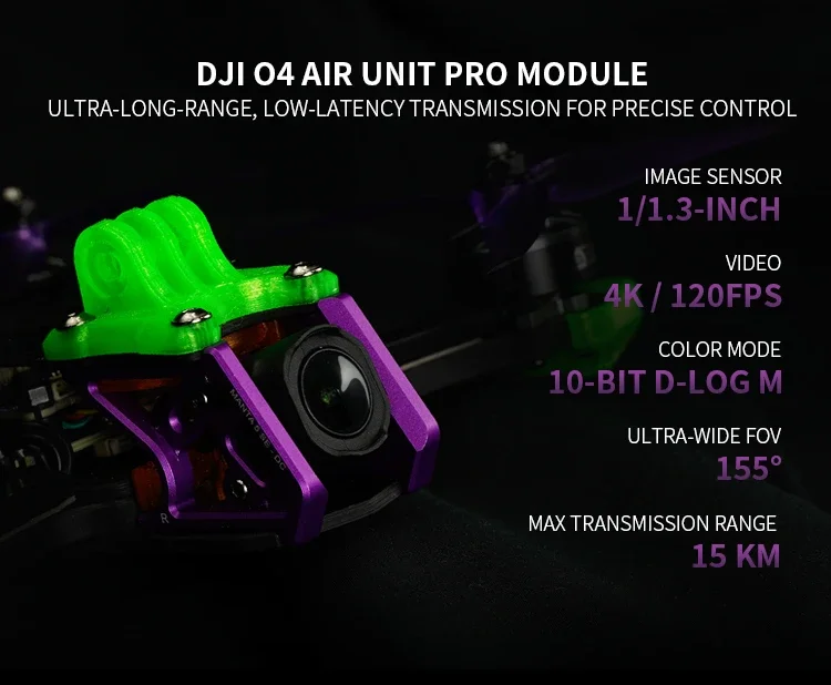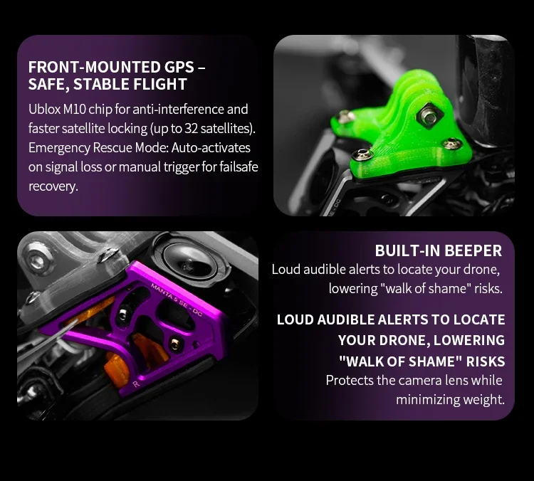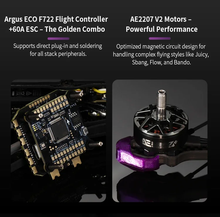 FPV Camera Integration: The frame is designed to fit 19–20mm wide FPV cameras, with aluminum side plates providing effective protection. The print section has been upgraded to ensure the lens is more securely fixed, eliminating jelly effects.