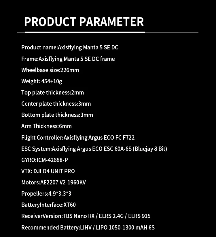 Motor Mounting: The motor mounting holes are 16×16mm, compatible with popular motors such as AF227 and AF236. We recommend using 4.9″–5.1″ freestyle propellers, such as those from BlackBird V3.