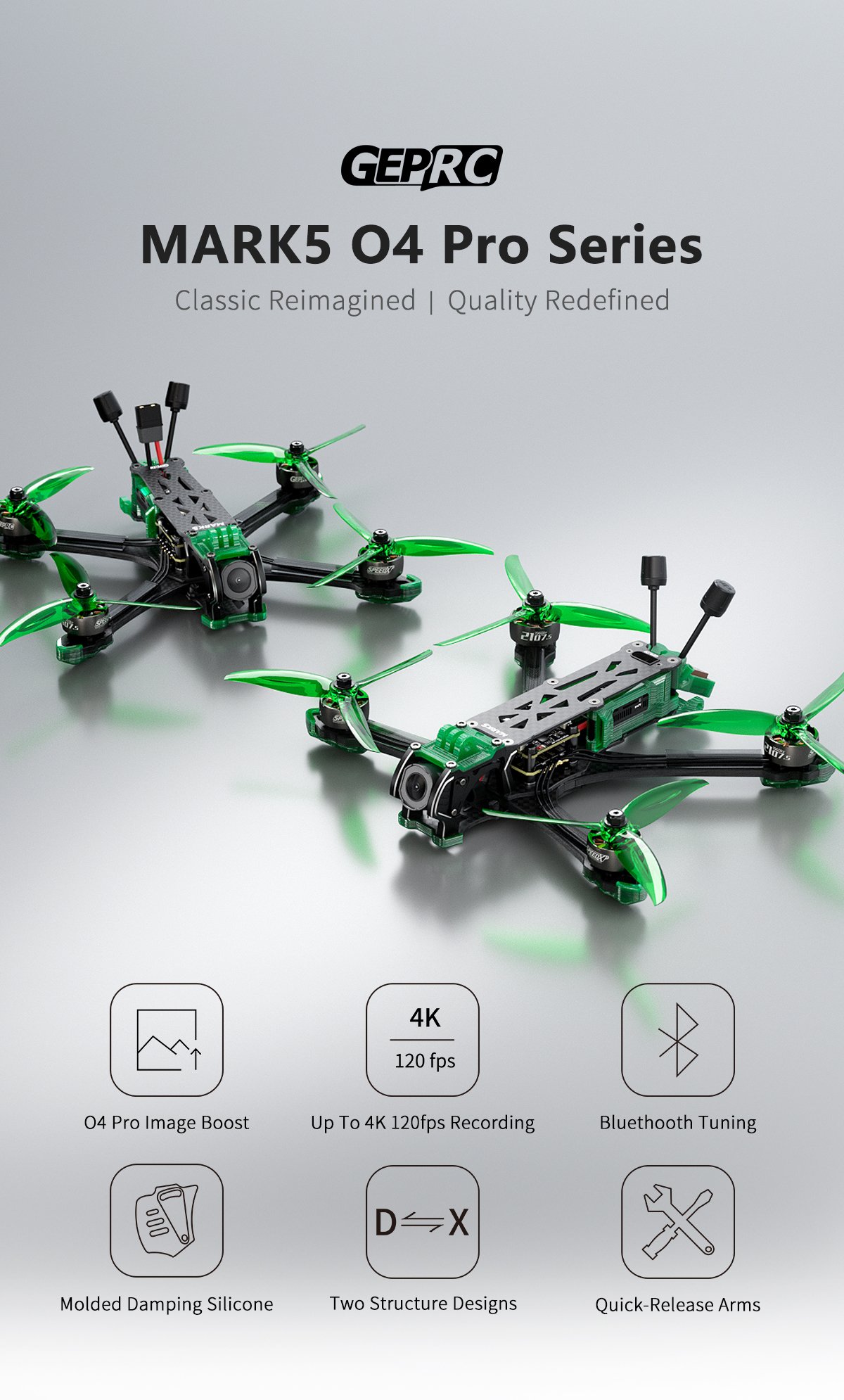 The GEPRC team developed the MARK5 O4 Pro series specifically for the DJI O4 Air Unit Pro VTX. With its 1/1.3-inch image sensor, the O4 Air Unit Pro takes digital HD video quality to the next level, offering enhanced low-light performance and sharper visuals. It supports up to 4K 120fps recording, with real-time transmission reaching 1080P 100fps.