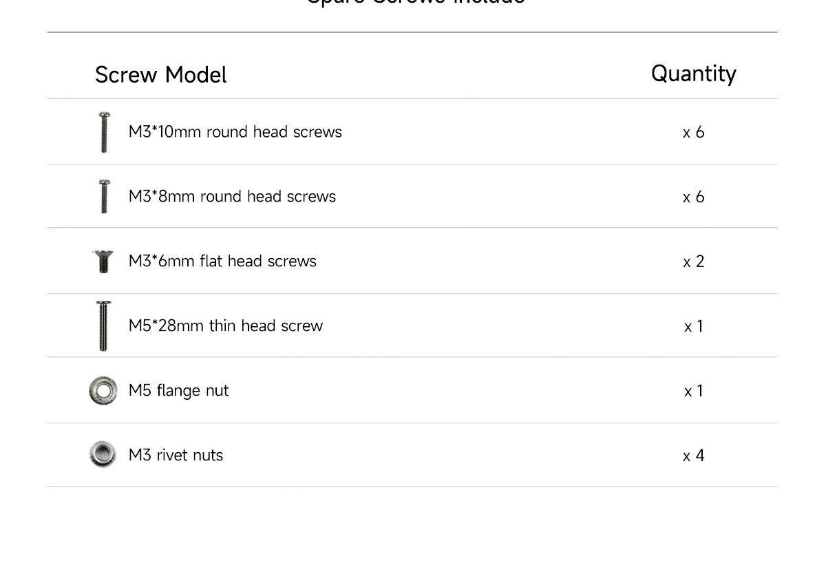 6 x M3*10mm round head screws 6 x M3*8mm round head screws 2 x M3*6mm flat head screws 1 x M5*28mm thin head screw 1 x M5 flange nut 4 x M3 rivet nuts