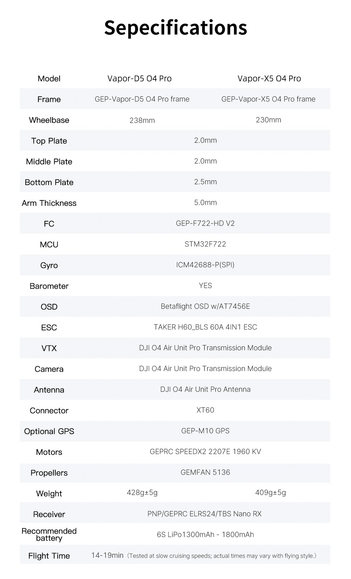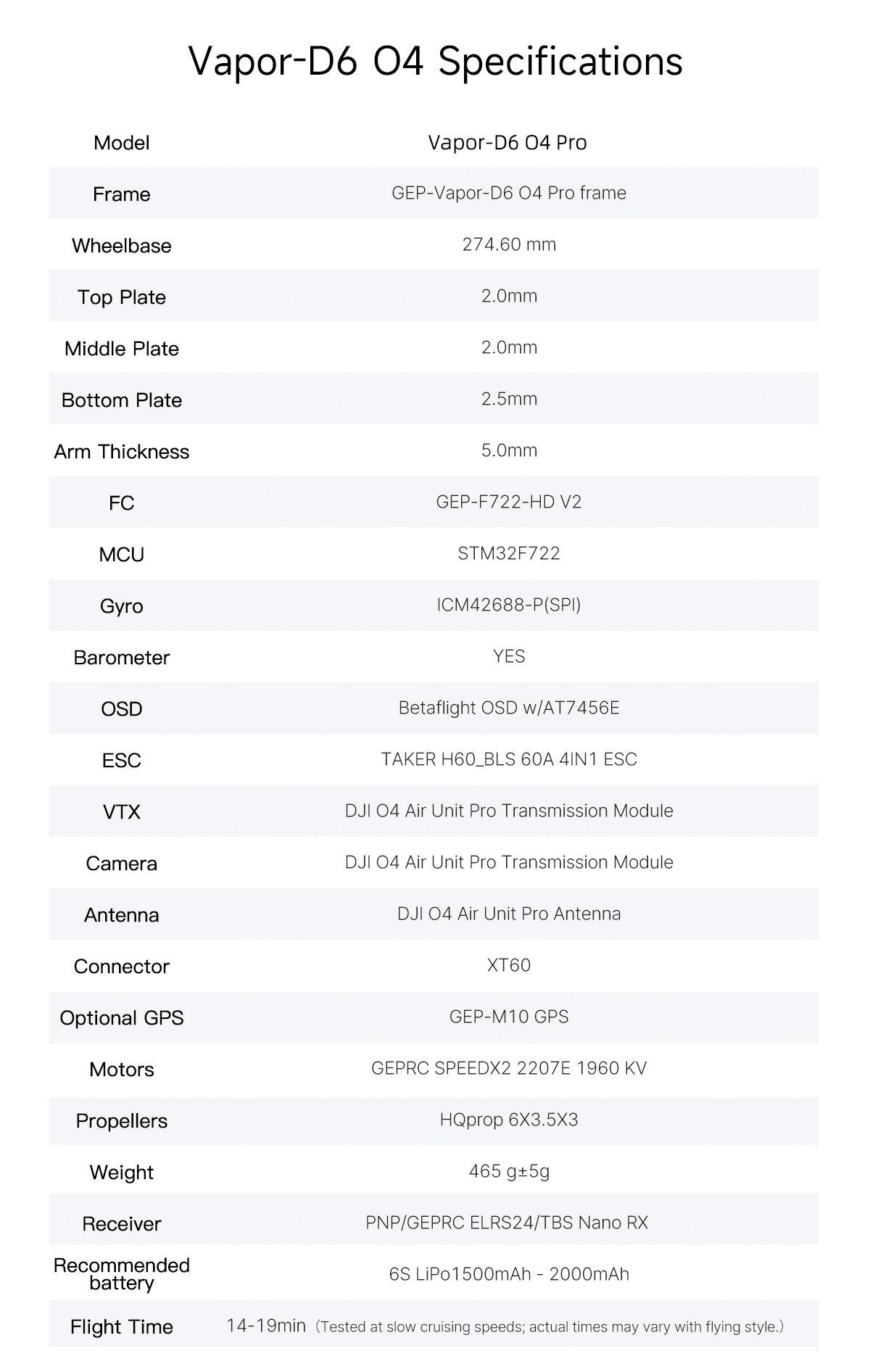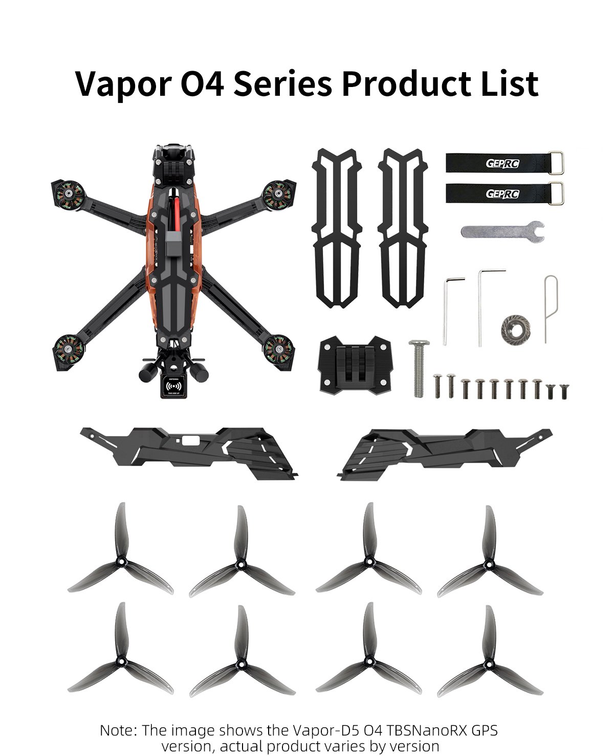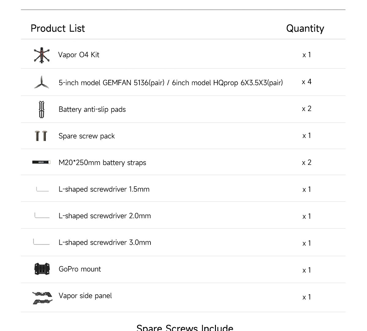 1 x Vapor-D6 O4 Pro 2 x HQprop 6X3.5X3 2 x Battery anti-slip pads 1 x Spare screw pack 1 x Vapor side panel 2 x M20*250mm battery straps 1 x L-shaped screwdriver 1.5mm 1 x L-shaped screwdriver 2.0mm 1 x GoPro mount