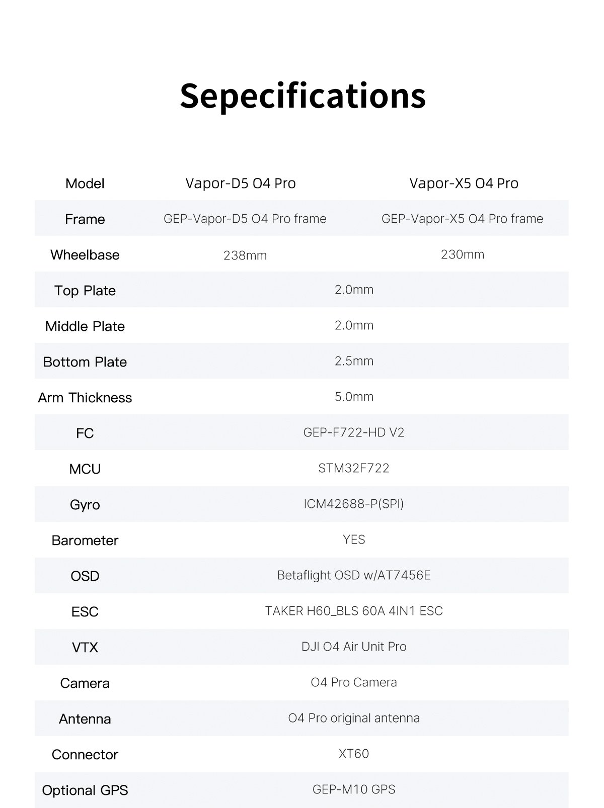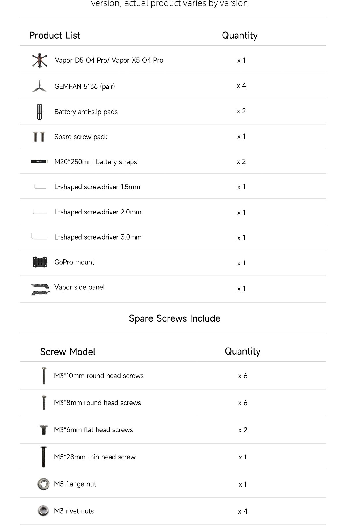 1 x Vapor-X5 O4 Pro 2 x GEMFAN 5136 2 x Battery anti-slip pads 1 x Spare screw pack 1 x Vapor side panel 2 x M20*250mm battery straps 1 x L-shaped screwdriver 1.5mm 1 x L-shaped screwdriver 2.0mm 1 x GoPro mount