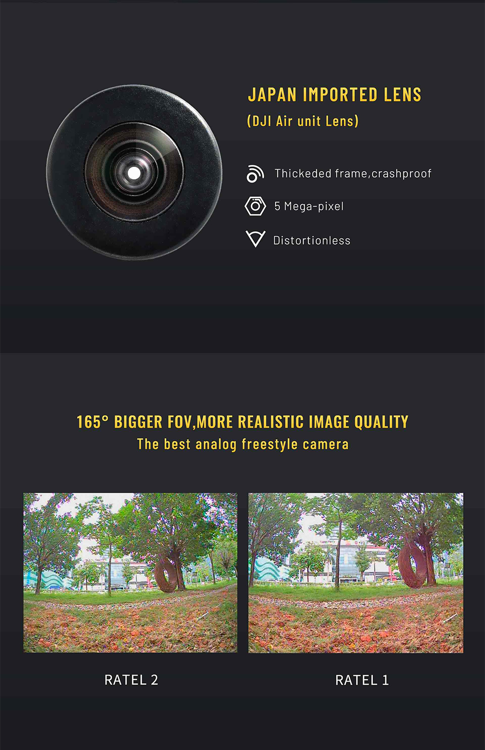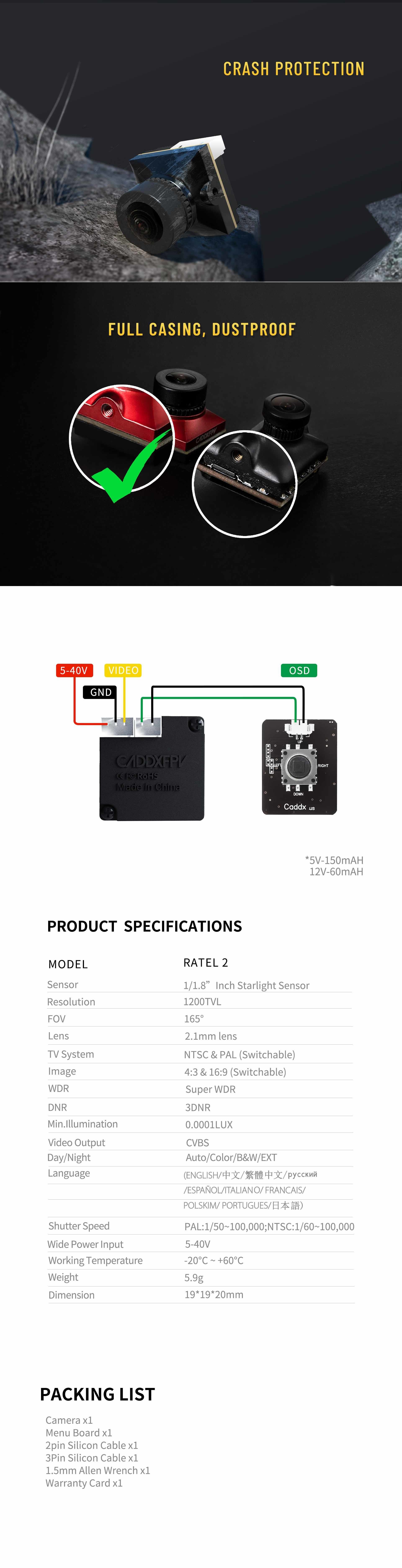 The Caddx Ratel 2 HDR Starlight 1200TVL FPV Camera features superb night vision, clear and sharper images. The Ratel 2 is equipped with high quality 1/1.8" inch starlight, a Super WDR sensor, providing up to 0.0001 sensitivity of lux, 8ms low latency, 4:3/16:9, and PAL/NTSC switchable, and a separate OSD menu.