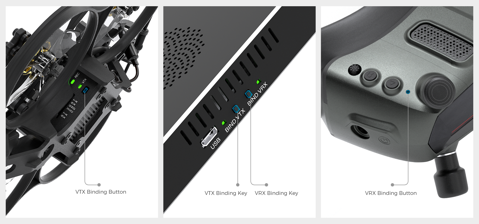 Step 1:Power on the ground unit, repeater, and air unit,Step 2:Press the pairing buttons on both the ground unit and the air unit,Step 3:After successful pairing, the indicator light turns green,Step 4:Binding is completed, and the VRX displays the image.