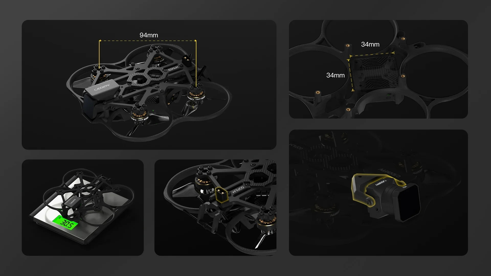 The frame features a 94mm wheelbase, with damping design for the camera, ensuring smoother video recording. Utilizing integrated injection molding technology, it simplifies installation by eliminating the hassle of adjusting screw tightness. Built-in XT30 plug design to avoid damaging wires. The standalone frame weighs only 30.5g, offering durability, crash resistance, and heat resistance. Compatible with most analog and HD VTX systems.