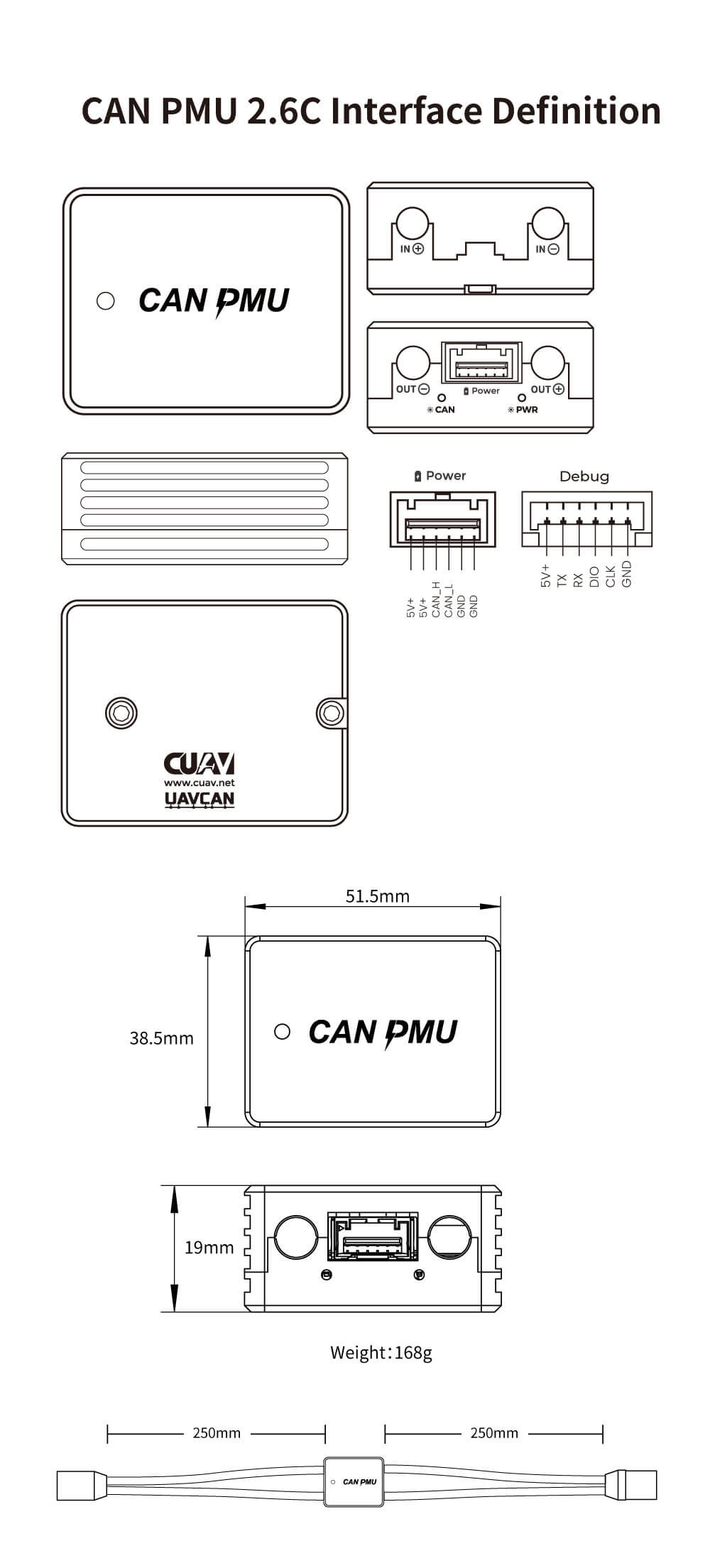CAN PMU is a drone power management module with built-in STM32F4 processor; running CUAV ITT compensation algorithm, can accurately measure the voltage and current of the drone; support 6~62V voltage input, and the POWER portcan output 5V/8A. It uses advanced CAN bus communication and supports the standard DroneCAN protocol; each PMU uses factory-level calibration to ensure good consistency and high accuracy.