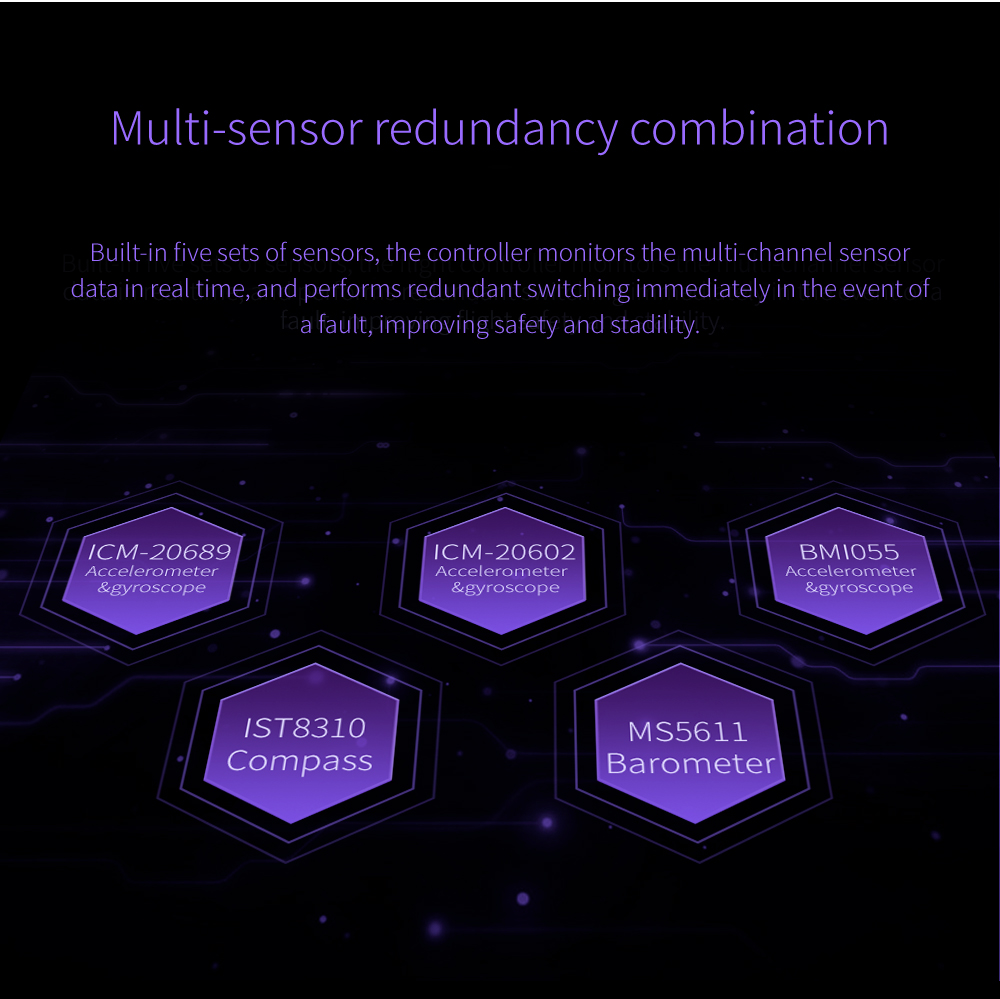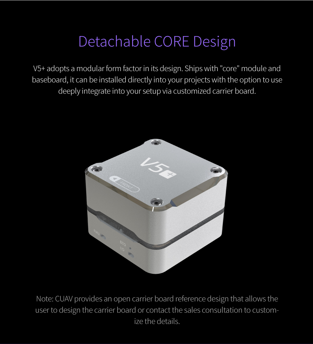 The CUAV V5+ is a high-performance flight controller designed to meet the demands of advanced UAV applications. It features the FMUv5 hardware standard, which is more advanced and stable than the FMUv3. The V5+ includes built-in shock absorption to minimize the impact of vibrations on flight stability. It supports an RTK centimeter-level GNSS module for precise positioning. The system is designed with multi-sensor redundancy, enhancing safety and reliability through real-time monitoring and failover capabilities. It offers full model support, ensuring compatibility with a wide range of UAVs. Additionally, the modular design allows for customization of the baseboard, providing flexibility to meet specific user requirements.