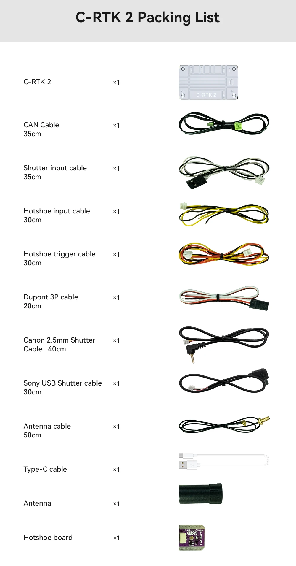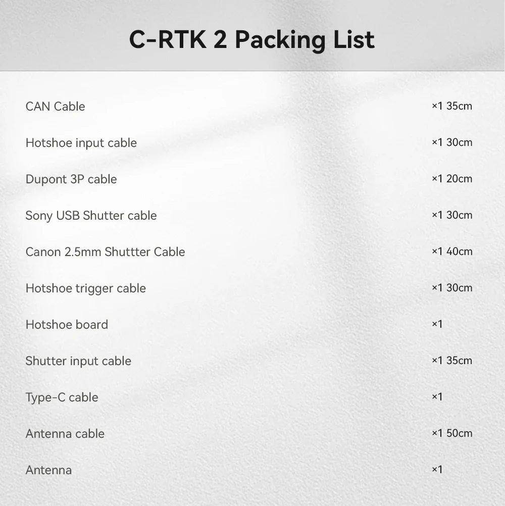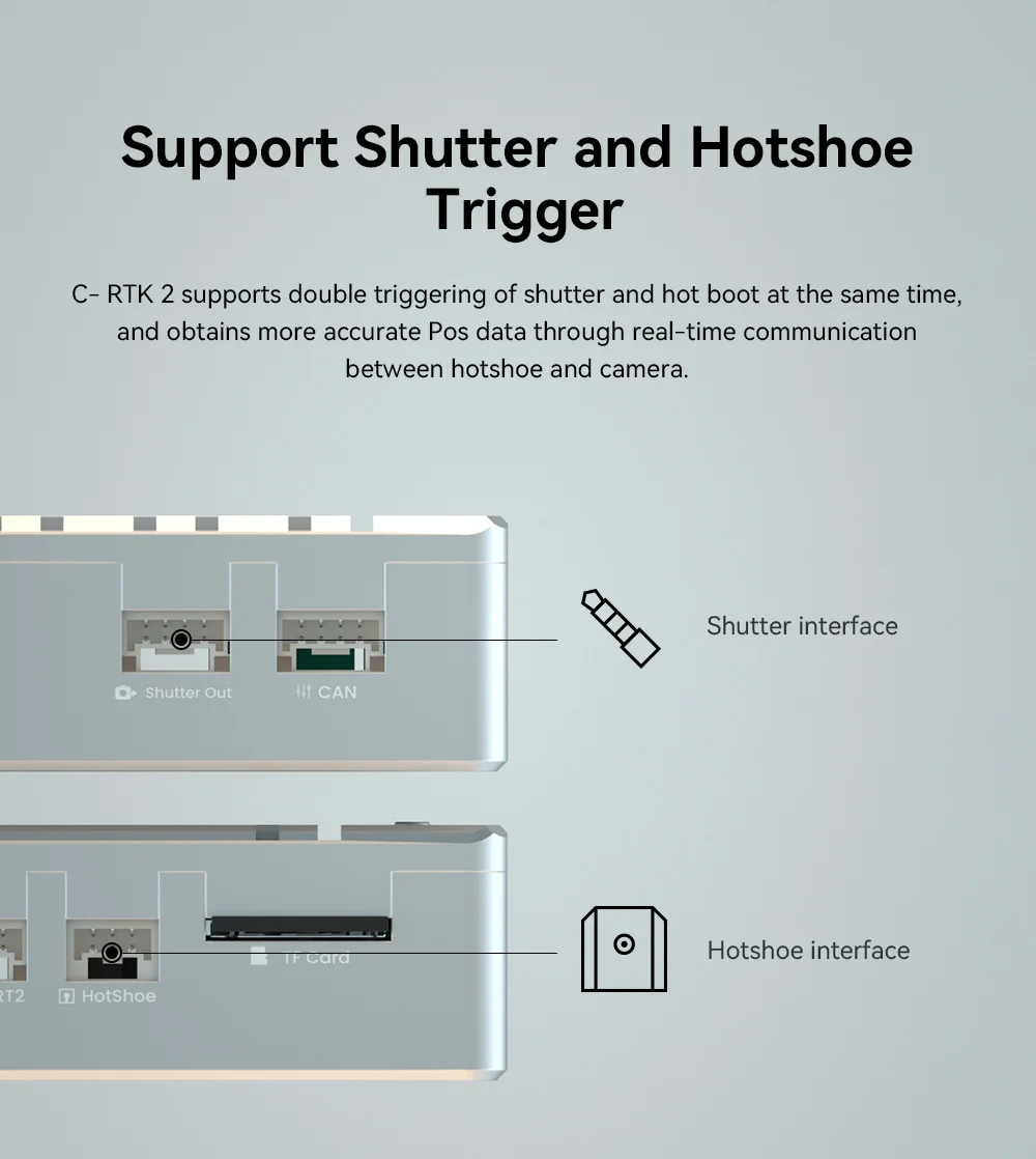 Hotshoe×1; Shutter in×1; Shutter out×1; Type-C×1; F9P USB×1; UART×1; CAN×1; MMCXAntenna×1 |