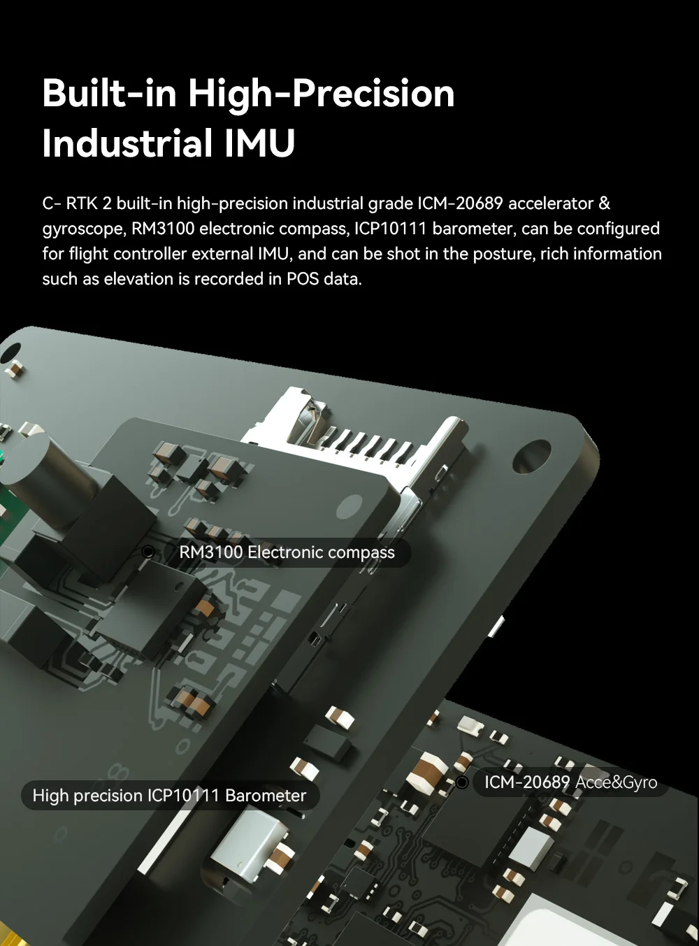 C-RTK 2 is a fully functional, cost-effective RTK module that can record raw data and shutter recording, support RTK and PPK, and can be used as a mobile station or base station.Using CAN bus communication mode, support high-speed USB and TF card storage, built-in RM3100 industrial electronic compass sensor, MS5611 barometer, ICM-42688-P Inertial navigation module module, using STM32H7 processor, running real-time system, especially suitable for aerial survey, agricultural plant protection and other application scenarios.