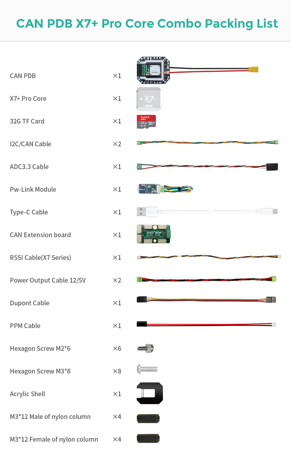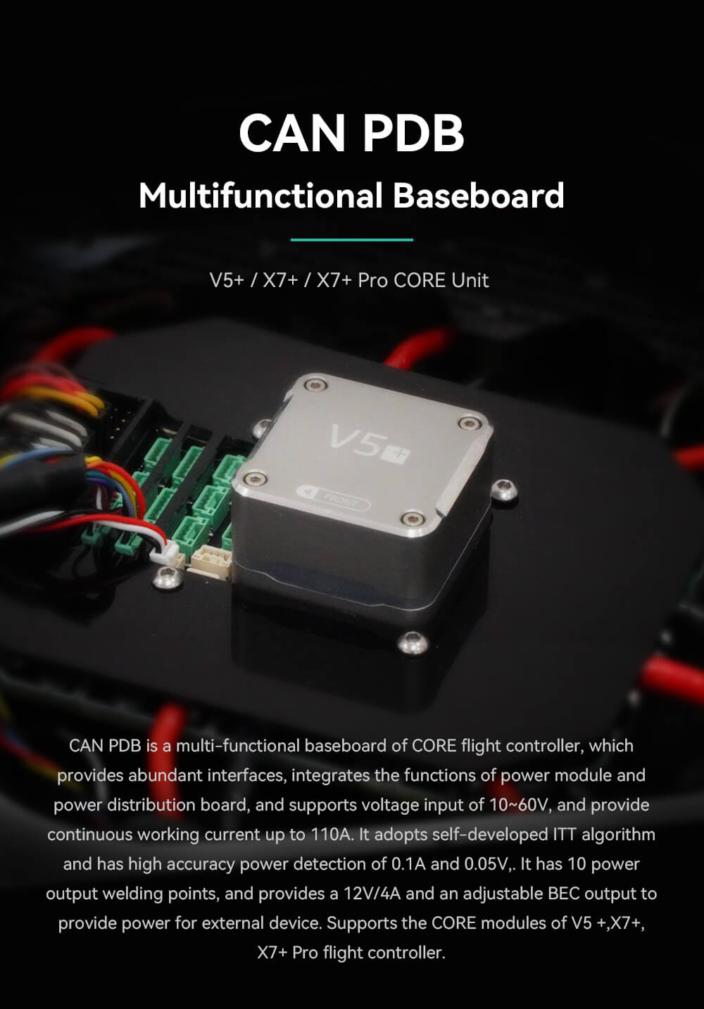 CAN PDB is a multi-functional baseboard of CORE controller, which provides abundant interfaces, integrates the functions of power module and power distribution board, and supports voltage input of 14~60V, and provide continuous working current up to 110A. It adopts self-developed ITT algorithm and has high accuracy power detection of 0.1 A and 0.05V. It has 10 power output welding points and provides a 5V/ 6A and a 12V /4A stabilized output to provide power for external device. Supports the CORE modules of V5+, X7+, and X7+ Pro Controller.