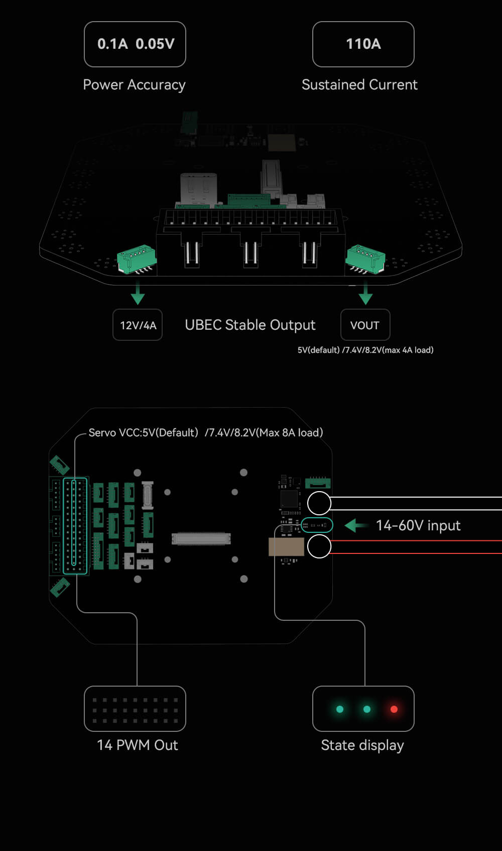 1–Support 14~60V voltage input, 110A current.