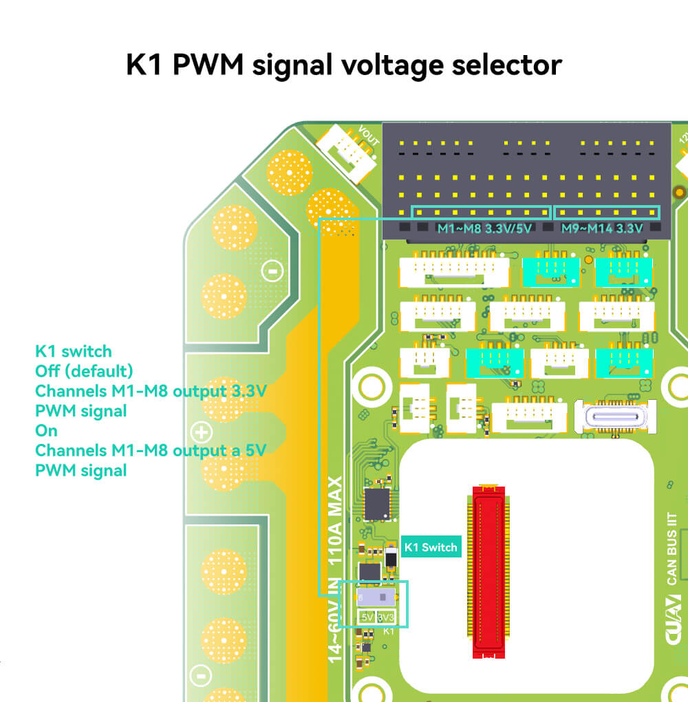 CAN PDB is a multi-functional baseboard of CORE controller, which provides abundant interfaces, integrates the functions of power module and power distribution board, and supports voltage input of 14~60V, and provide continuous working current up to 110A. It adopts self-developed ITT algorithm and has high accuracy power detection of 0.1 A and 0.05V. It has 10 power output welding points and provides a 5V/ 6A and a 12V /4A stabilized output to provide power for external device. Supports the CORE modules of V5+, X7+, and X7+ Pro Controller.
