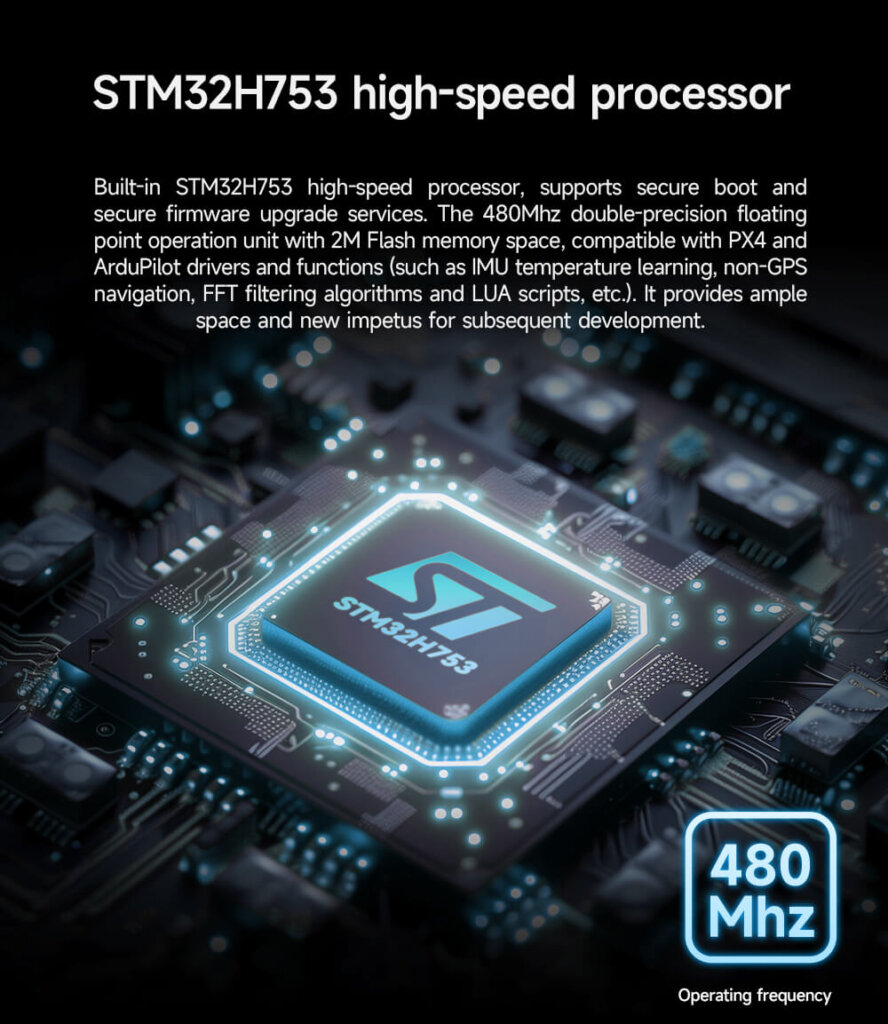 Built-in STM32H753 high-speed processor, supports secure boot and secure firmware upgrade services. The 480MHz double-precision floating-point operation unit with 2M Flash memory space, compatible with PX4 and ArduPilot drivers and functions (such as lMU temperature learning, non-GPS navigation, FFT filtering algorithms, and LUA scripts etc.). It provides ample space and new impetus for subsequent development.