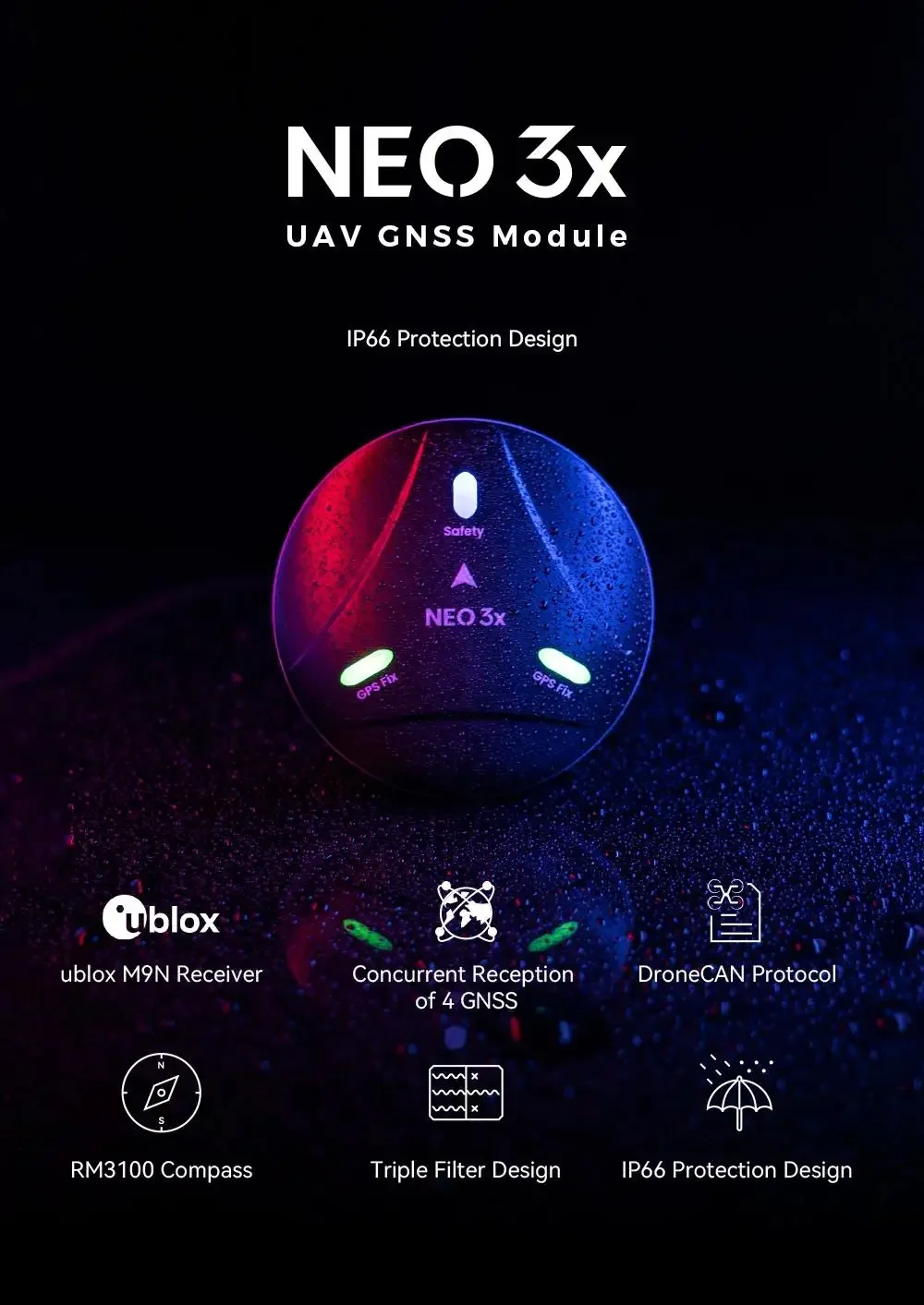 The CUAV New NEO 3X M9N GPS offers reliable positioning with GNSS technology, supporting DroneCAN and CAN Protocol for seamless integration. Ideal for advanced drones, it ensures precise navigation and robust communication for professional unmanned applications.