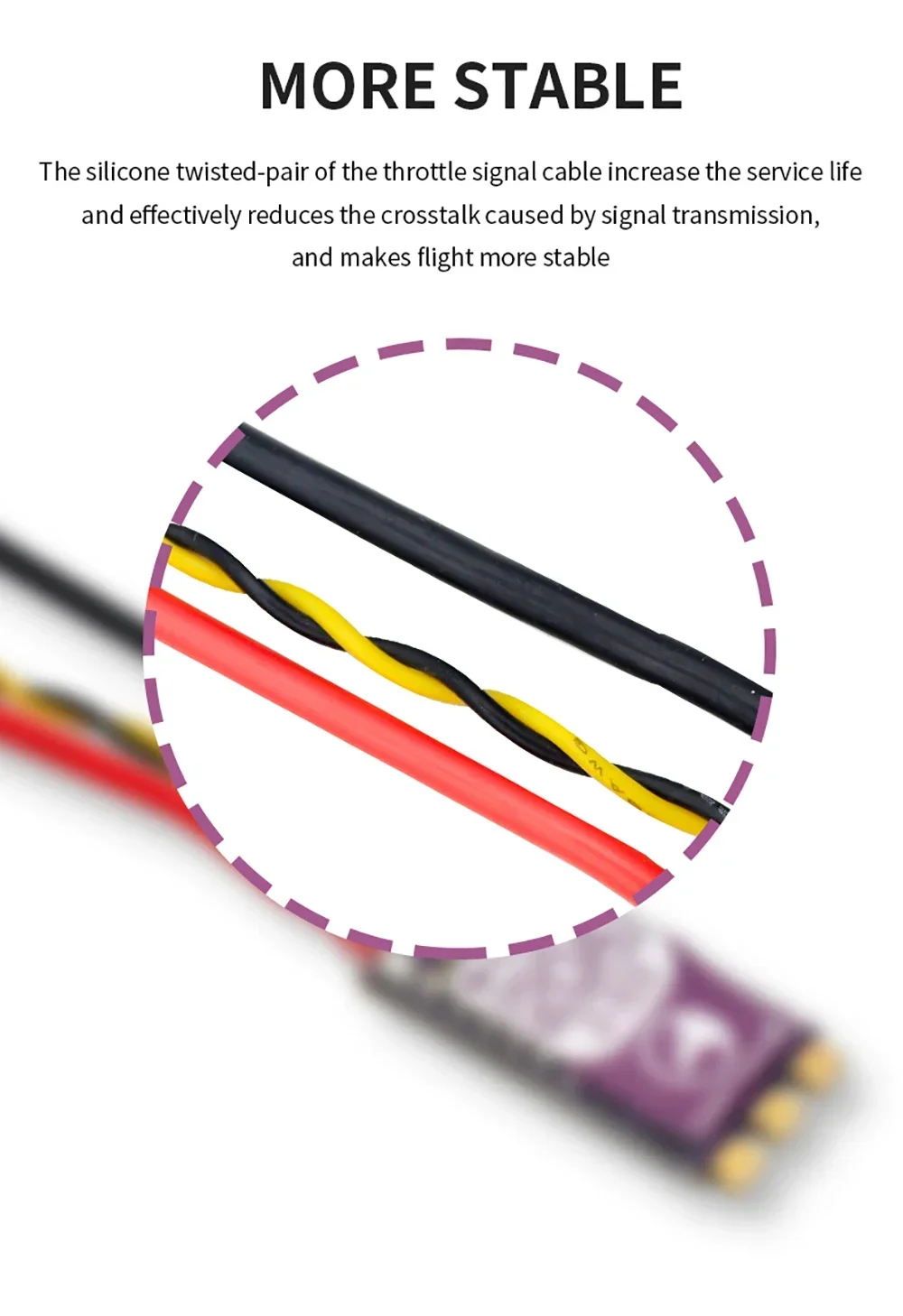 3.More Stable Brushless ESC: The silicone twisted-pair of the throttle signal cable increase the service life and effectively reduces the crosstalk caused by signal transmission and makes flight more stable