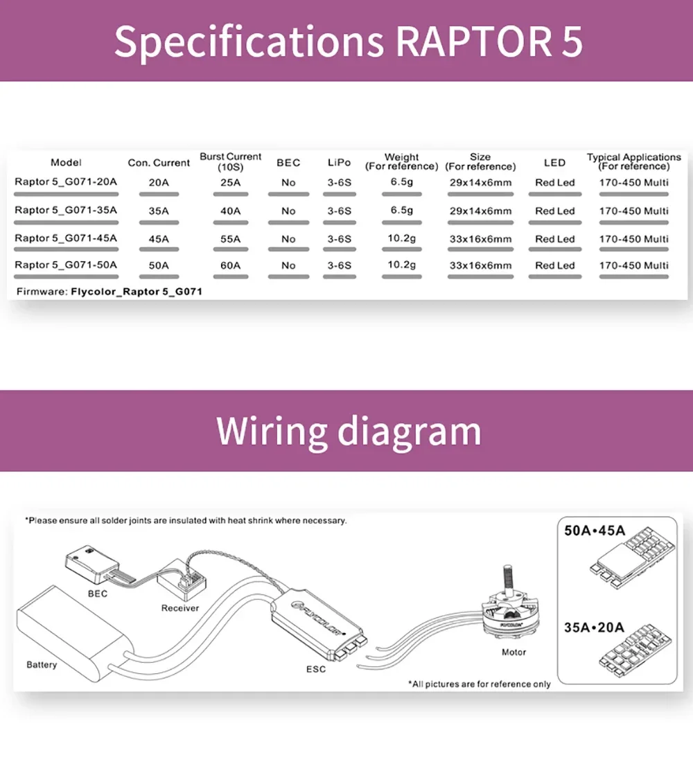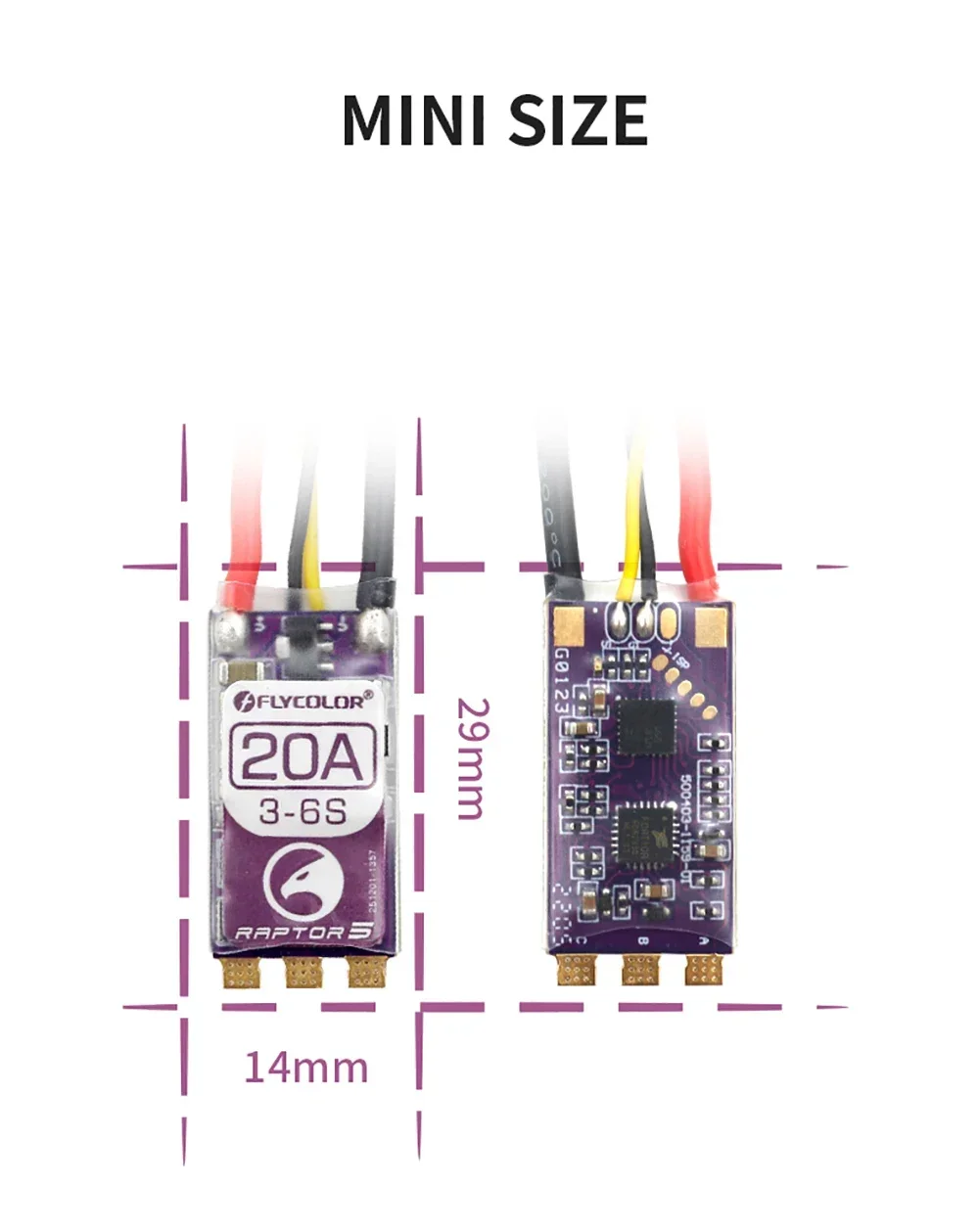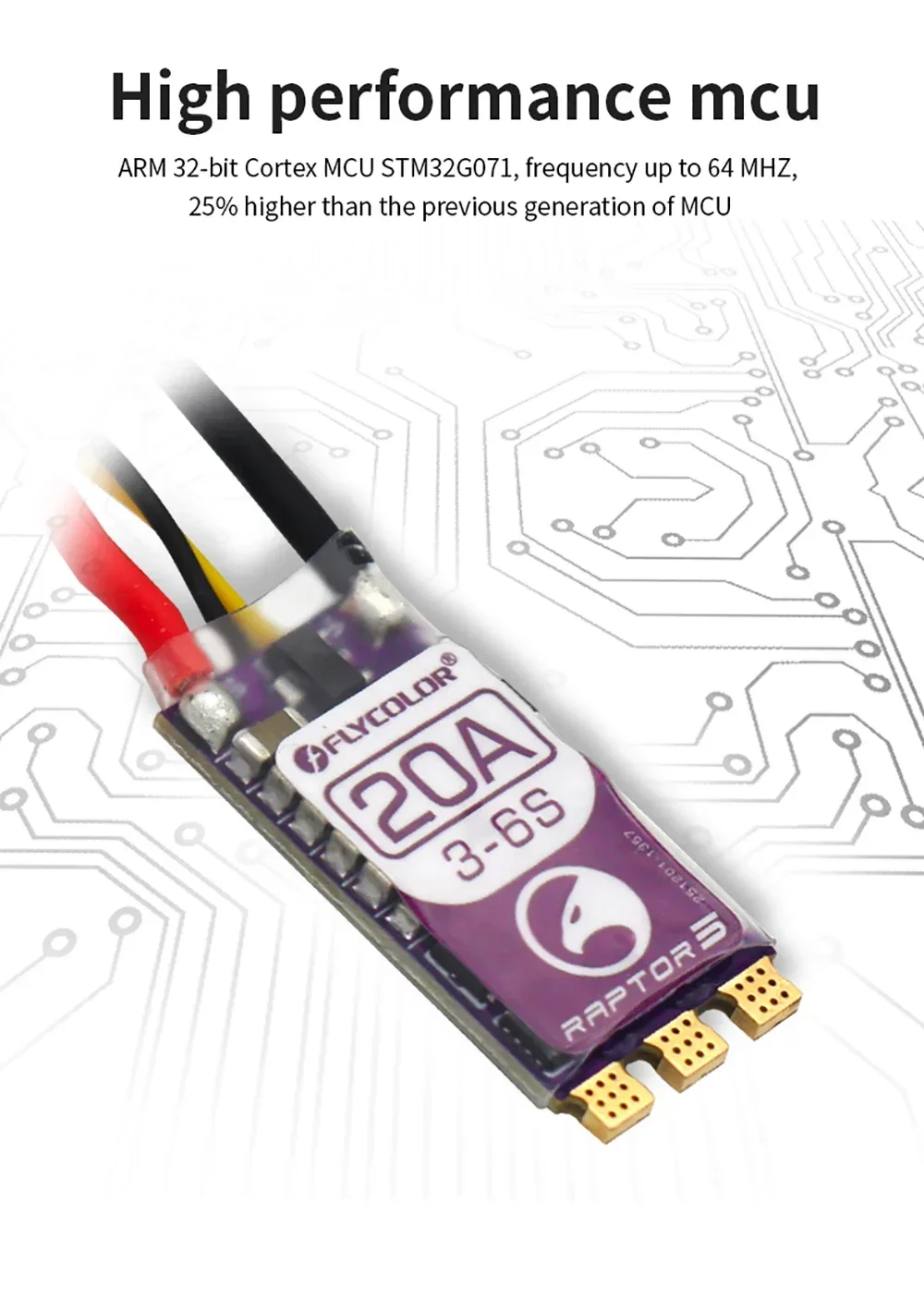 FLYCOLOR Raptor5 Brushless ESC 3-6S Drone ESC is a high-performance component that enhances the speed and control of your racing drone. PMW128K / High performance  ARM 32-bit Cortex MCU STM32G071 / All Dshot and Proshot signals are supported.With advanced technology and customization settings, this ESC delivers exceptional durability and reliability for even the most demanding racing conditions. Upgrade your drone's performance with the FLYCOLOR Raptor 5 ESC today.