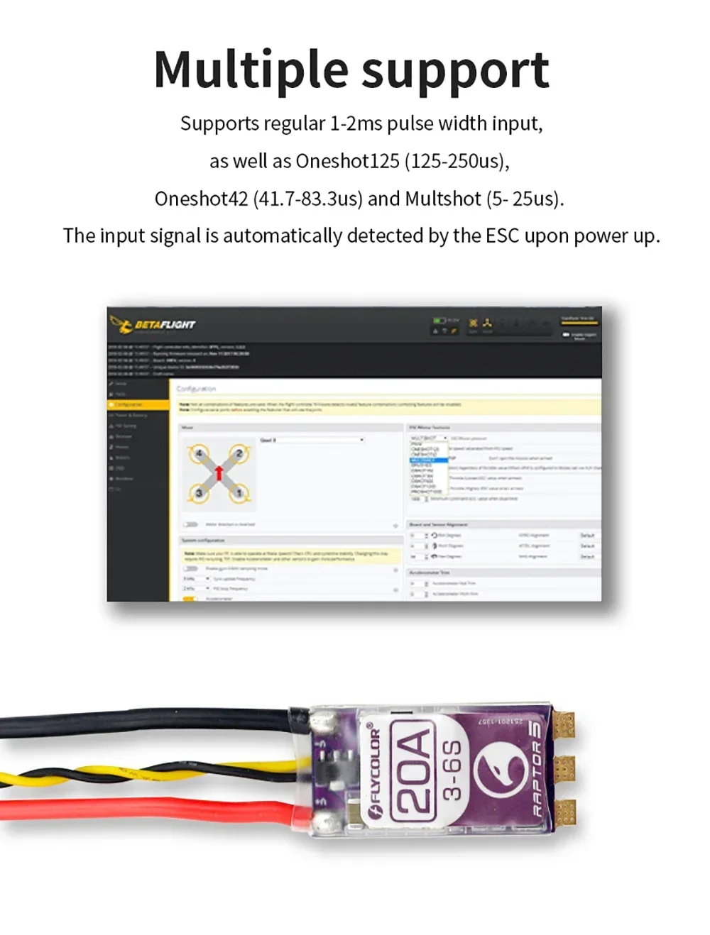 2.Multiple Support Drone ESC: Support all DSHOT digital signal, up to DSHOT 1200;Supports regular 1-2ms pulse width input ,as well as Oneshot125 ( 125-250us ) , Oneshot42 ( 41 . 7-83 3us ) and Multshot ( 5-25us )The input signal is automatically detected by the ESC upon power up
