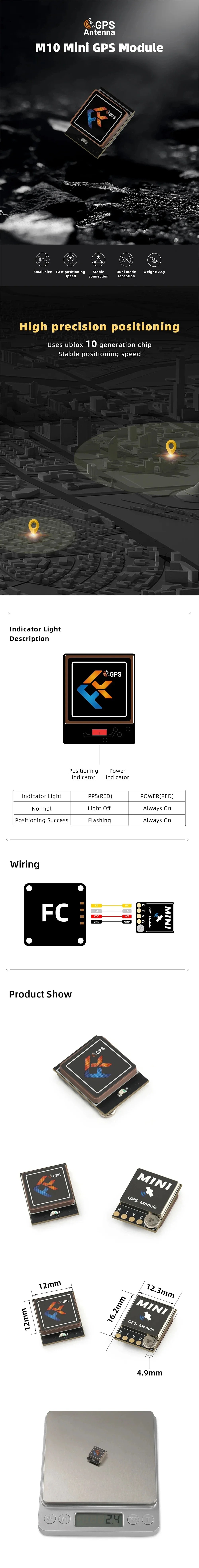 FlyfishRC-M10 Mini is a GPS that is small in size, fast in speed, and easy to use. It features an 12*12mm RHCP ceramic patch antenna that provides excellent reception and highly stable connectivity. The UBLOX 10th generation chip allows for skipping minor changes in altitude, improving stability.