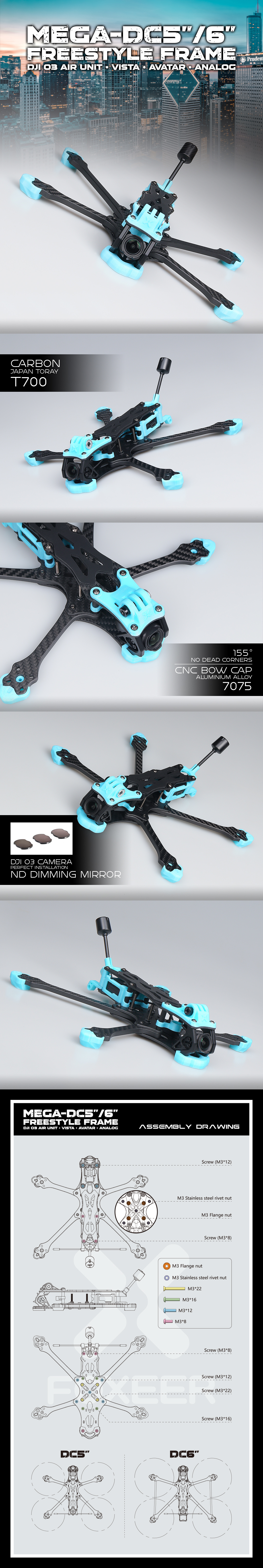 FOXEER MEGA 5" 238mm / 6" 269mm DC Frame is a drone frame designed by the FOXEER brand. It is suitable for FPV racing and free flight. The frame uses Toray T700 is made of high-quality carbon fiber material to provide excellent performance and durability. It is available in 5-inch (238mm) and 6-inch (269mm) wheelbase options to suit different flying styles and needs. The design may be compatible with a variety of cameras. and flight systems such as O3, Analog, Vista, Walksnail, HDZero, etc., the 5-inch version weighs about 136 grams, and the 6-inch version weighs about 152 grams (excluding TPU), which allows the frame to focus on lightweight design while maintaining strength.