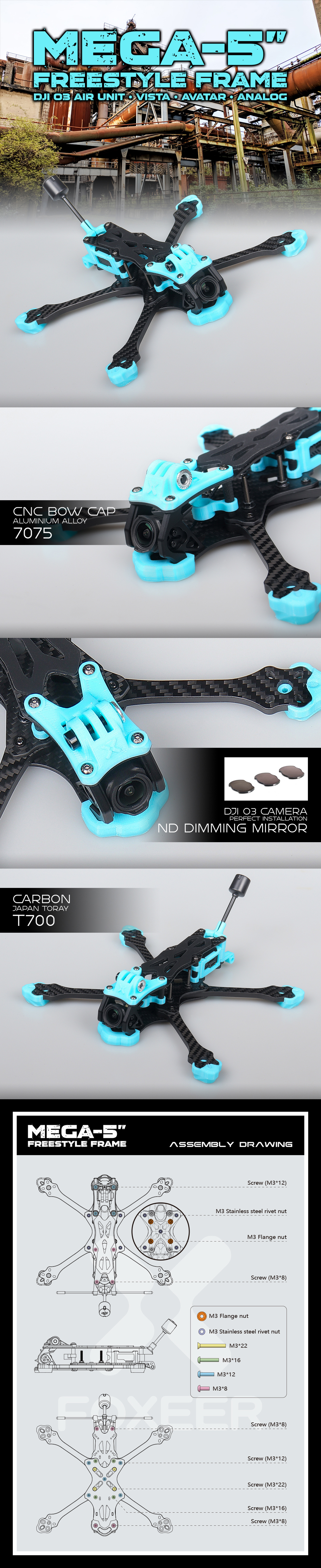 FOXEER MEGA 5" 220mm FPV Frame is a drone frame specially designed for Freestyle. It uses Toray T700 carbon fiber material to ensure the high strength and lightweight of the frame, providing excellent durability and performance.