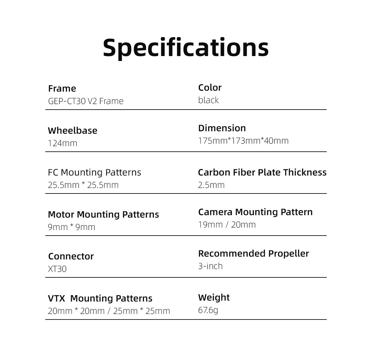 • VTX Mounting Patterns: 20mm * 20mm / 25mm * 25mm