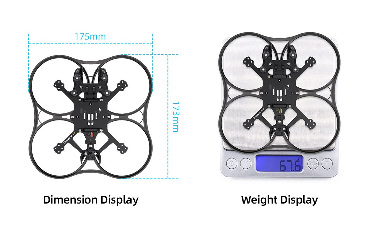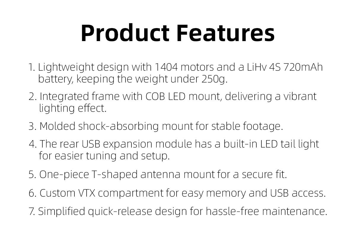 1.  Lightweight design with 1404 motors and a LiHv 4S 720mAh battery, keeping the weight under 250g.