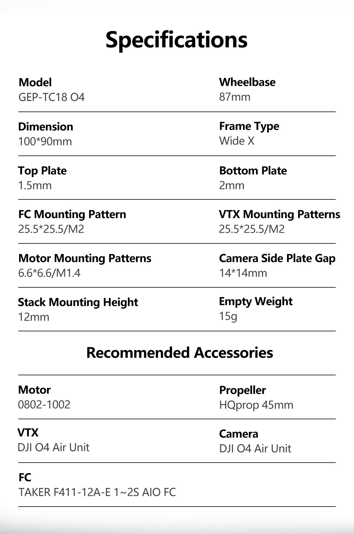 • VTX Mounting Hole:  25.5*25.5/M2