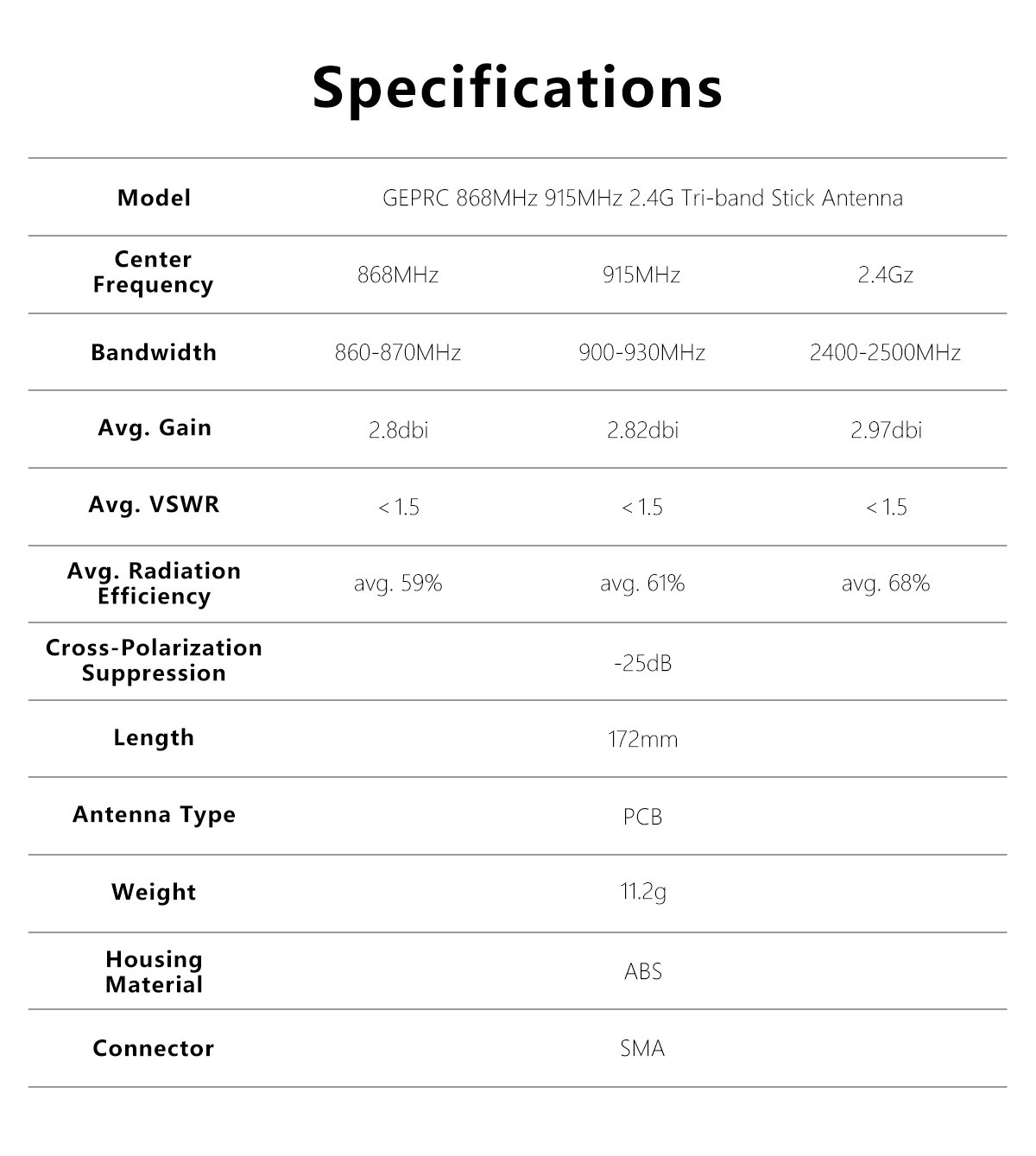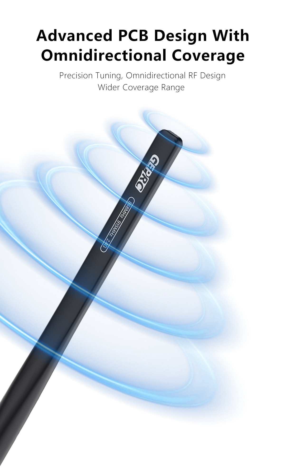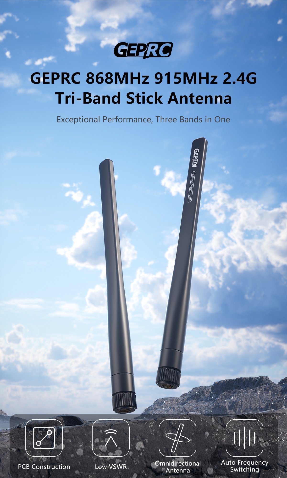 The GEPRC 868MHz/915MHz/2.4GHz tri-band stick antenna features a PCB design with linear polarization for omnidirectional signal reception. It maintains strong connectivity during dynamic flight maneuvers. With excellent cross-polarization suppression, it performs well in high-interference environments, minimizing signal disruption.
