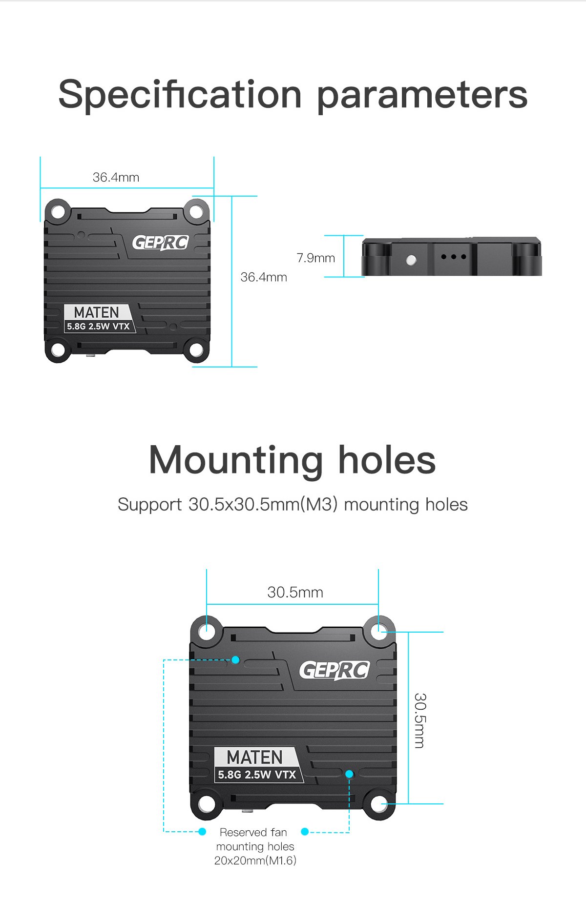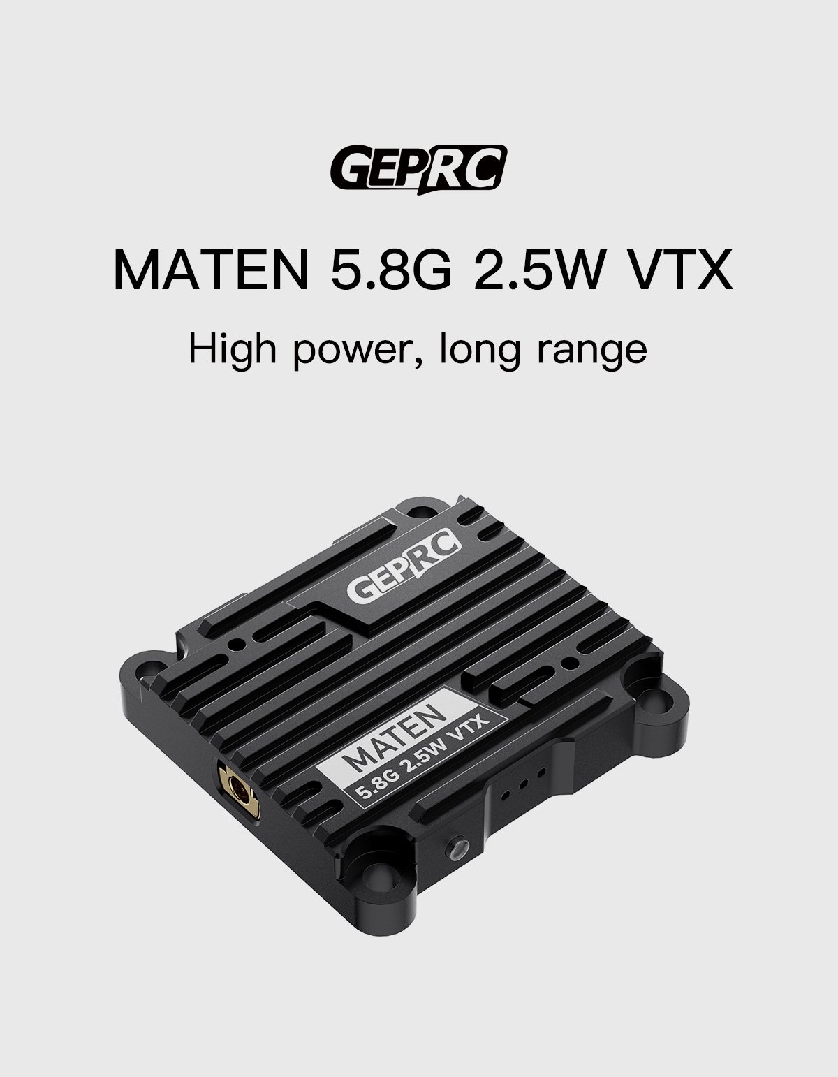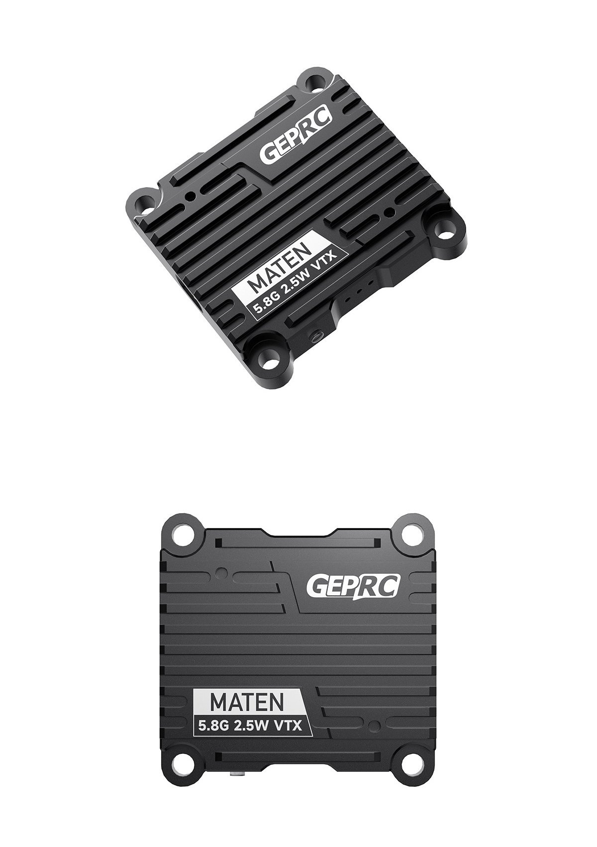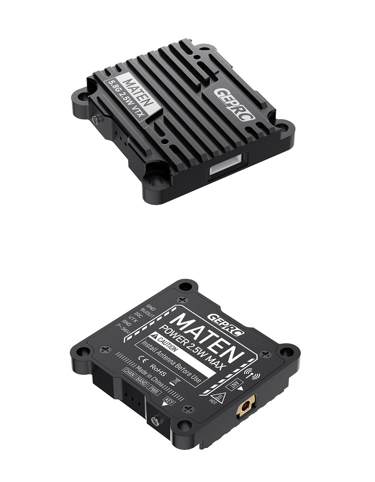 The MATEN 5.8G 2.5W VTX high-power image transmission newly developed by the GEPRC team is now officially released. Its performance is very powerful, with 5 adjustable power levels and a maximum power of up to 2500mW.The transmission signal is very stable and the penetration ability is excellent. MATEN 5.8G 2.5W VTX uses high-strength aluminum alloy CNC shell to assist heat dissipation.The unique appearance design stronger impact resistance and better heat dissipation performance. It supports the IRC Tramp protocol and can use the OSD to quickly adjust parameters. It has a wide voltage input of 7-36V and temperature control protection function to prevent overheating and burning.Support 30.5×30.5mm(M3) installation hole position.