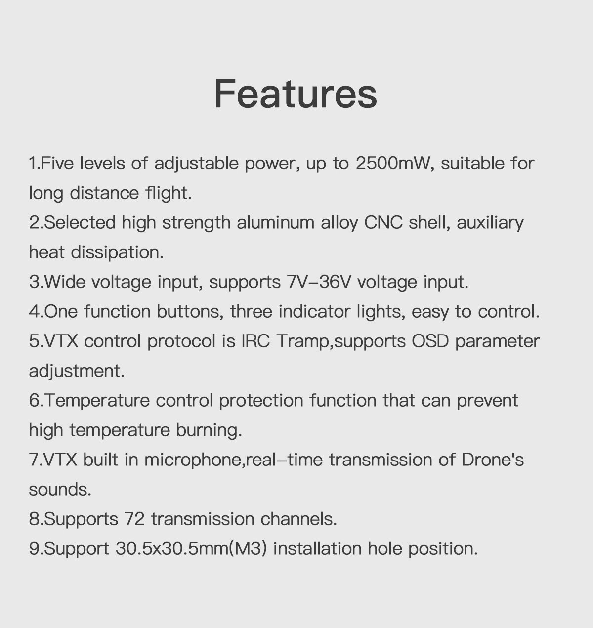 Five levels of adjustable power, up to 2500mW, suitable for long distance flight.