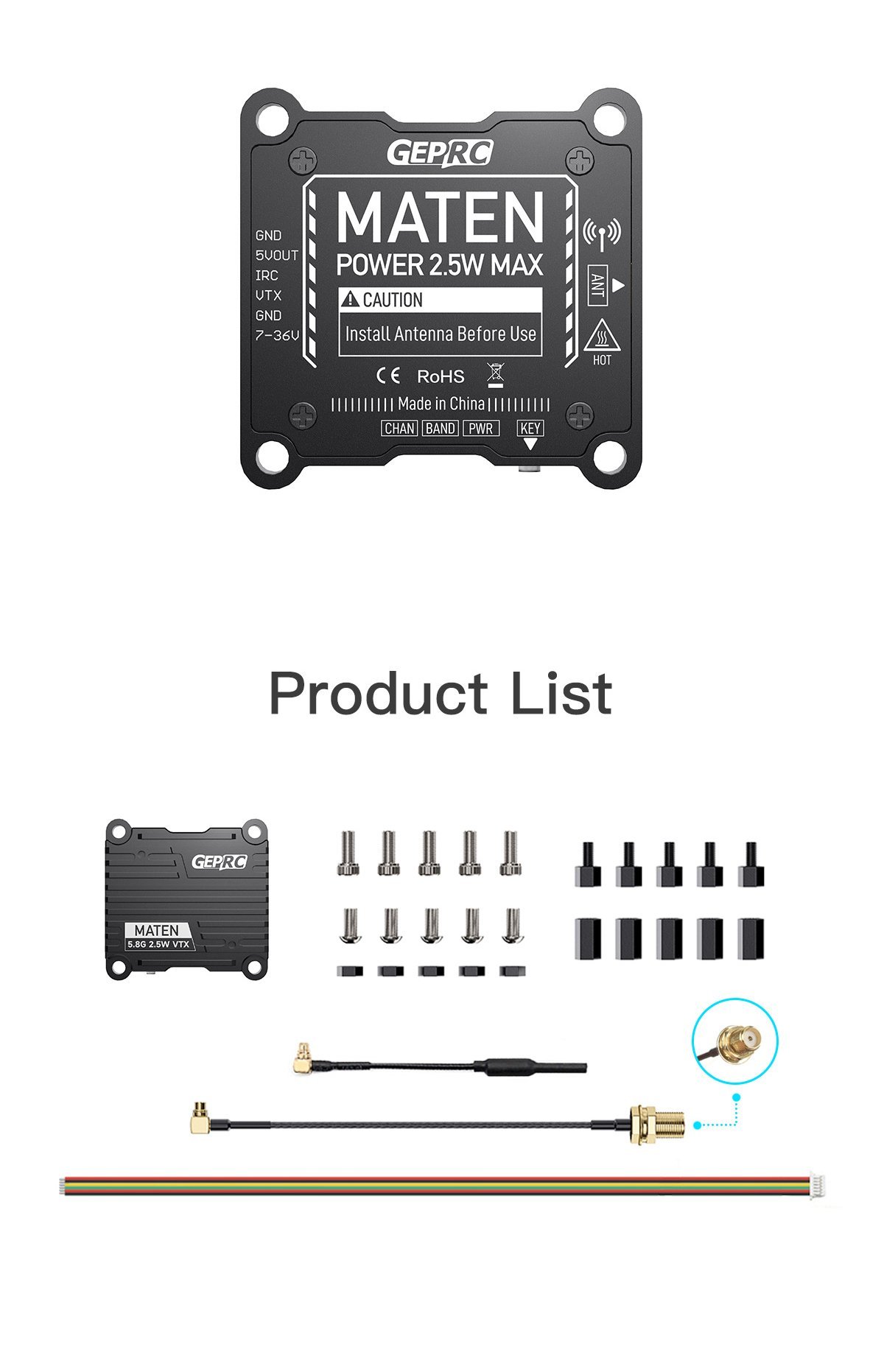 1 x MATEN 5.8G 2.5W VTX 1 x MMCX Copper tube antenna 1 x MMCX to SMA connector 1 x sh1.0 6P Connecting cable 5 x M3*7 screws 5 x M3*8 screws 5 x M3 x 10 hexagon 5 x M3*5 isolation column 5 x M3 nylon nut 1 x product description
