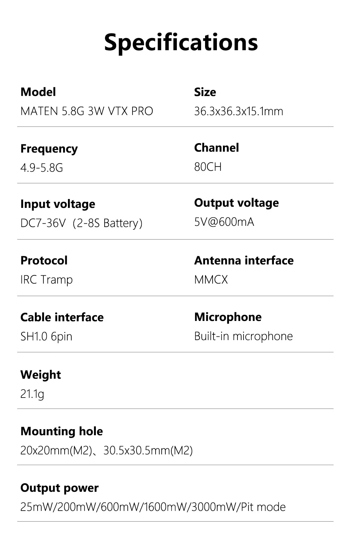 - Output power: 25mW/200mW/600mW/1600mW/3000mW/Pit mode