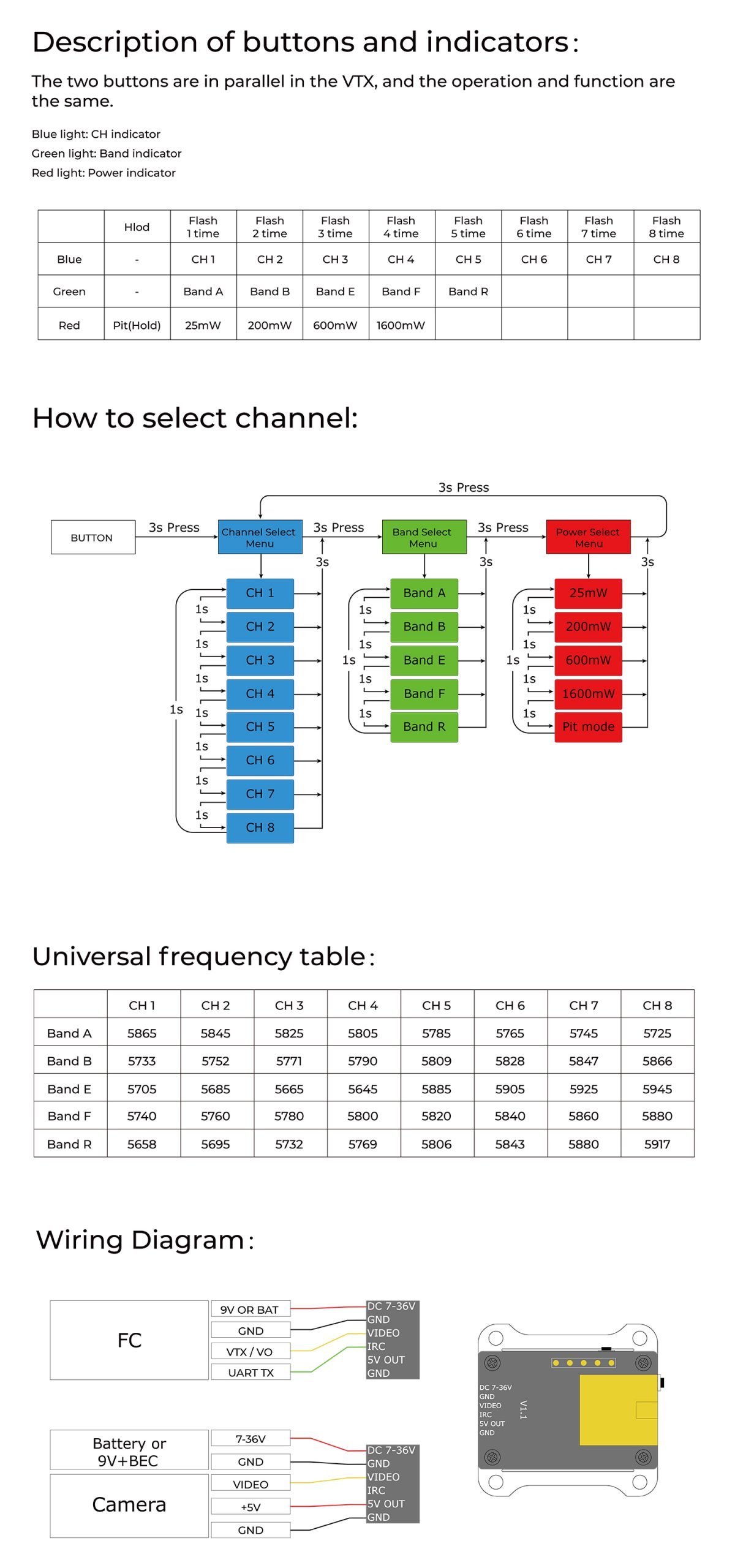 3. The 5V Output is for a Camera/Cooling Fan use only!Do not connect Power Input/Battery to 5V Out. Serious damage will occur to VTX.