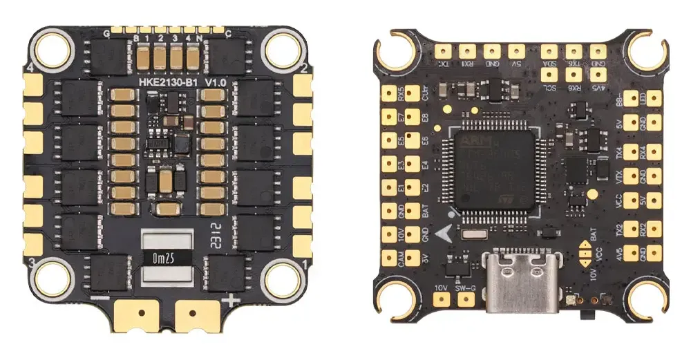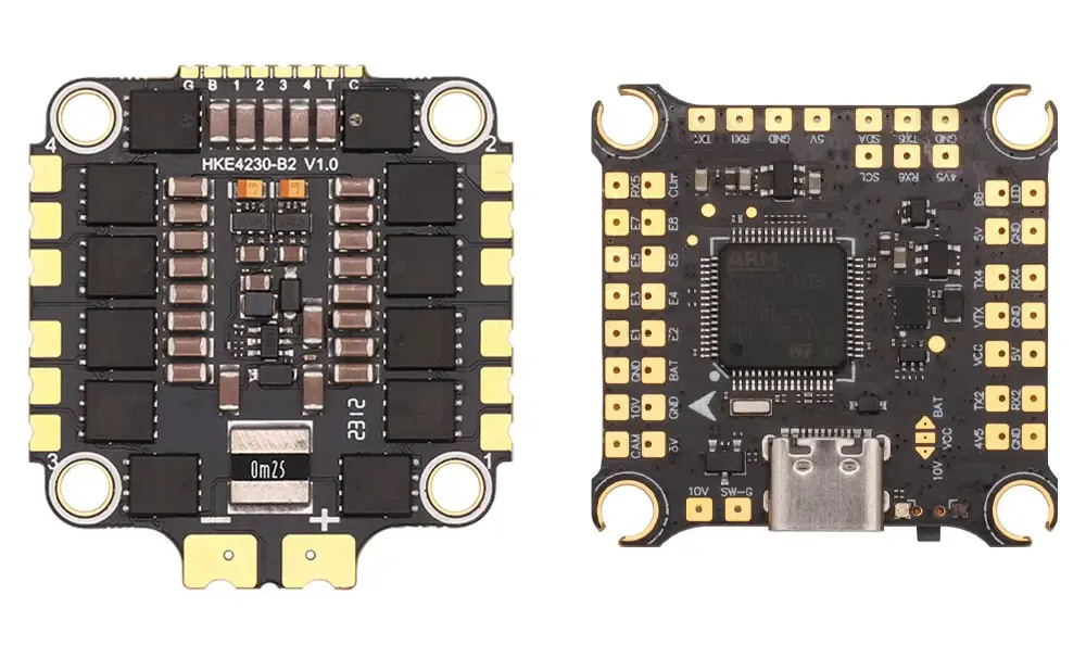 The HAKRC F405 V2 Stack features the STM32F405RET6 CPU, ICM42688 IMU, AT7456E OSD, and dual BEC (5V/3A, 9V/2.5A). Available with 45A/50A/60A/65A 4in1 brushless ESC, it supports 3-6S input, 16MB memory, and robust flight performance.