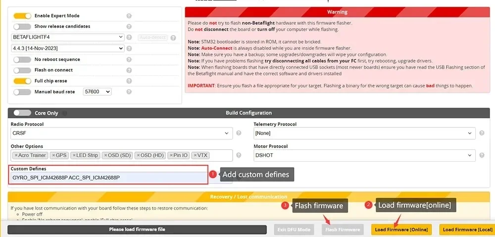 If upgrade firmware to betaflight 4.4.x , need to add custom Defines ''GYRO_SPI_ICM42688P ACC_SPI_ICM42688P'' from build configuration of betaflight configurator otherwise gyro will not working .