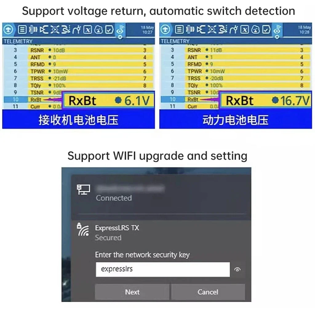 The return function can automatically detect the voltage input to be used.   A 4-wire CRSF interface is provided.