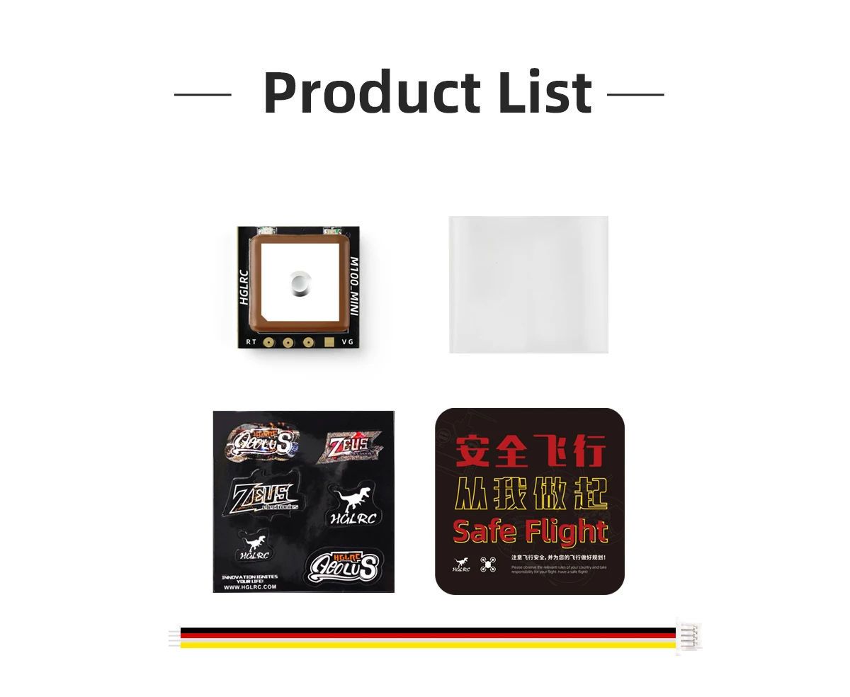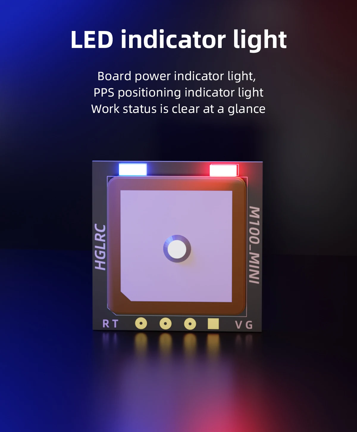 Hello everyone, our M80 PRO gps has been well-received and loved by everyone in the past two years. Beginning in the new 2023, HGLRC will bring you the newly developed M100_MINI GPS. Using the new 10th generation UBX chip design, the positioning is fast and accurate. In the test of our HGLRC laboratory, it takes less than 1 minute for GPS to reach the 8 satellites required for take-off. The small and exquisite 15mmx15mm Size can be loaded on 2-7 inch traversing Drone. Selected ceramic antenna and externally expanded PCB design allow M100_MINI GPS to receive satellite signals effectively. At the same time, it supports receiving GPS, Galileo, and BDS three satellite signals, allowing you to quickly locate in any area. For the convenience of everyone, we have designed onboard LED indicators, including power indicator and positioning PPS indicator, so that you can know the working status of GPS well.