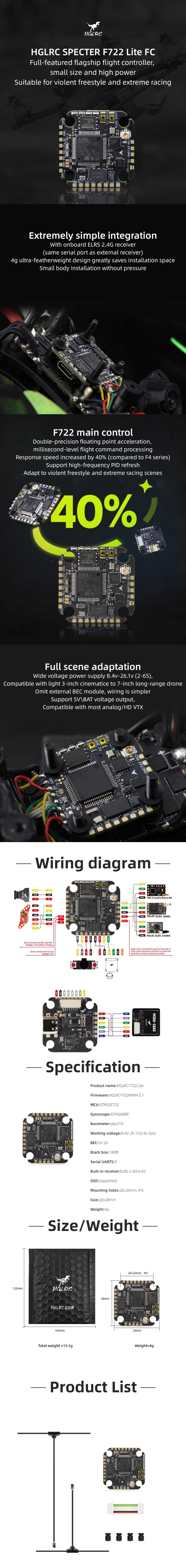 Minimal integration: The flight control comes with an onboard ELRS 2.4G receiver, and an external receiver is also available. The 4g ultra-featherweight design greatly saves installation space, and the small fuselage can be installed without pressure