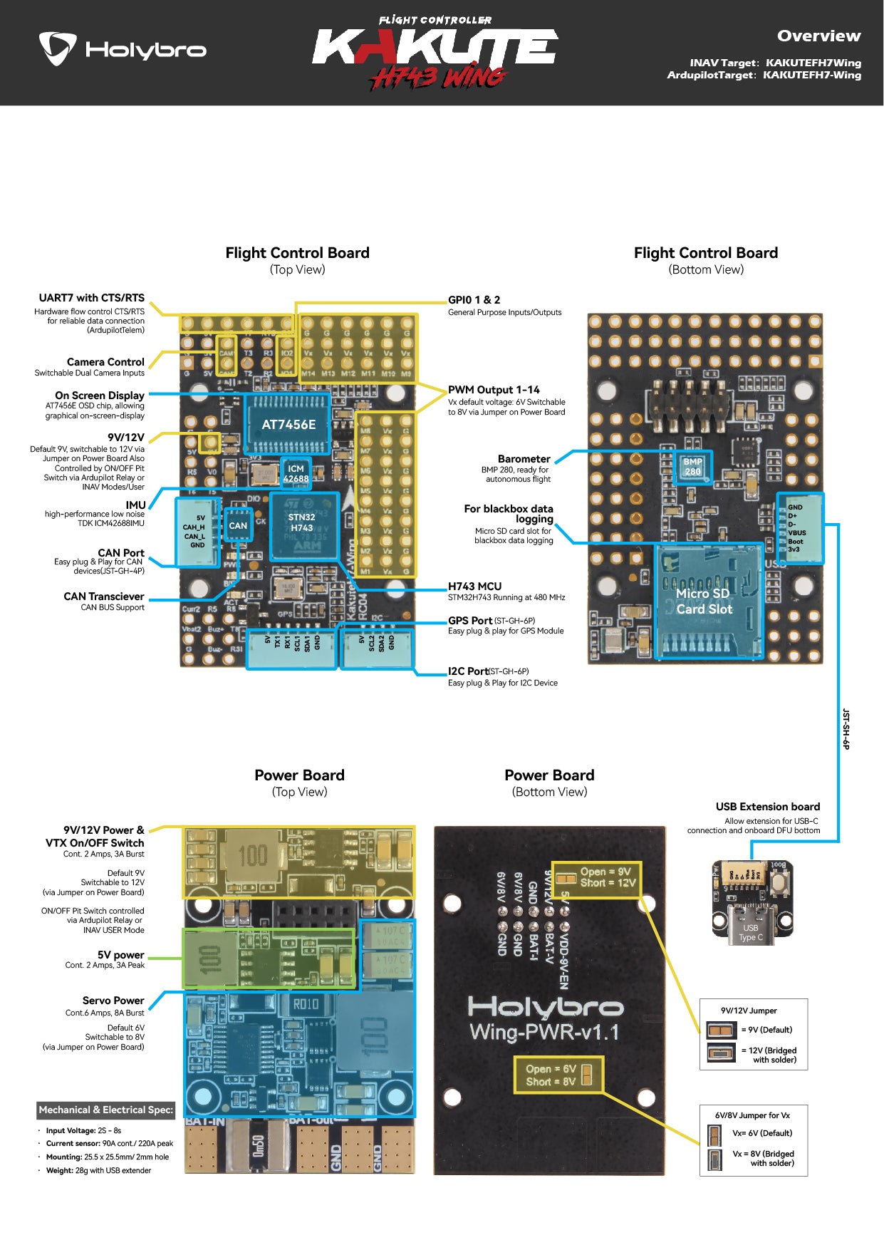 The Holybro Kakute H743 Wing is a full featured flight controller with layout specifically for fixed wing & VTOL applications. It has the STM32 H743 Processor running at 480 MHz and CAN Bus support, along with dual camera support & switch, ON/OFF Pit Switch, 5V, 6V/8V, 9V/12 BEC, and plug-and-play GPS, CAN, I2C ports.
