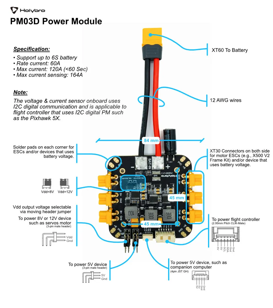 • This PM uses I2C digital signal data output, Compatible with Pixhawk 5X/6X Series.