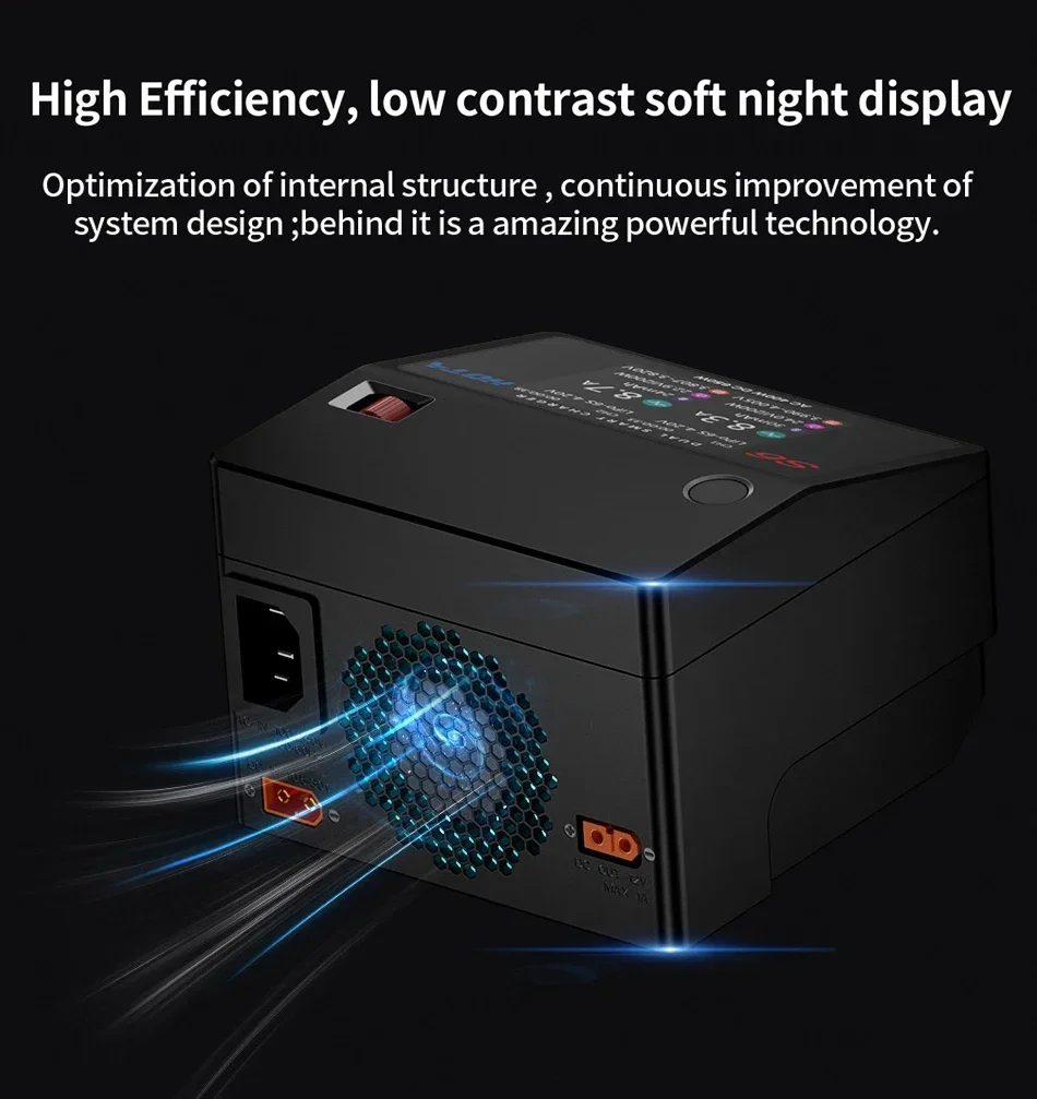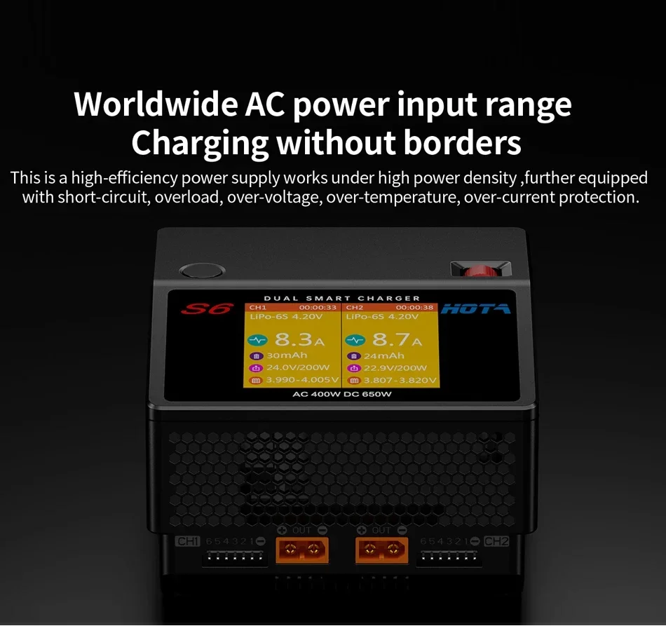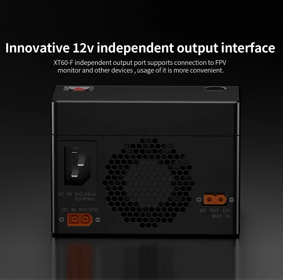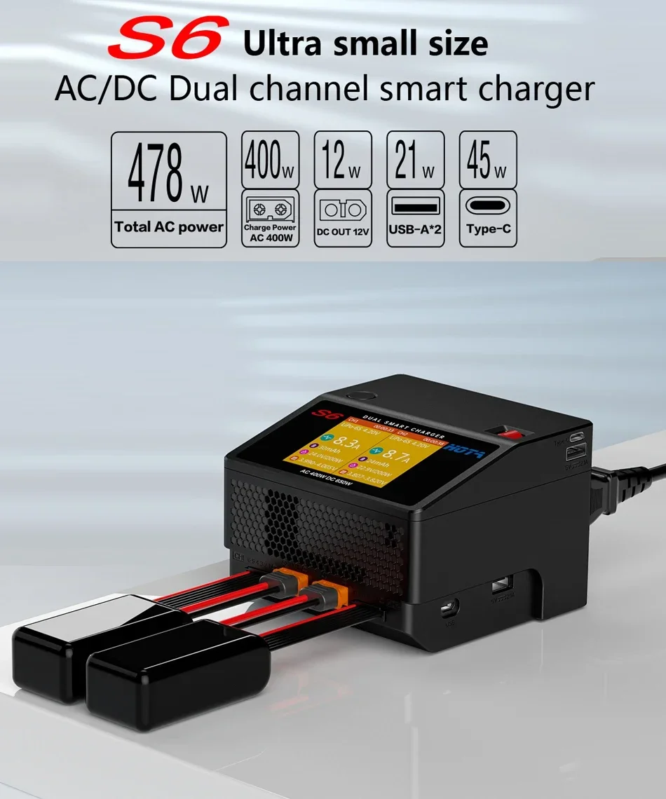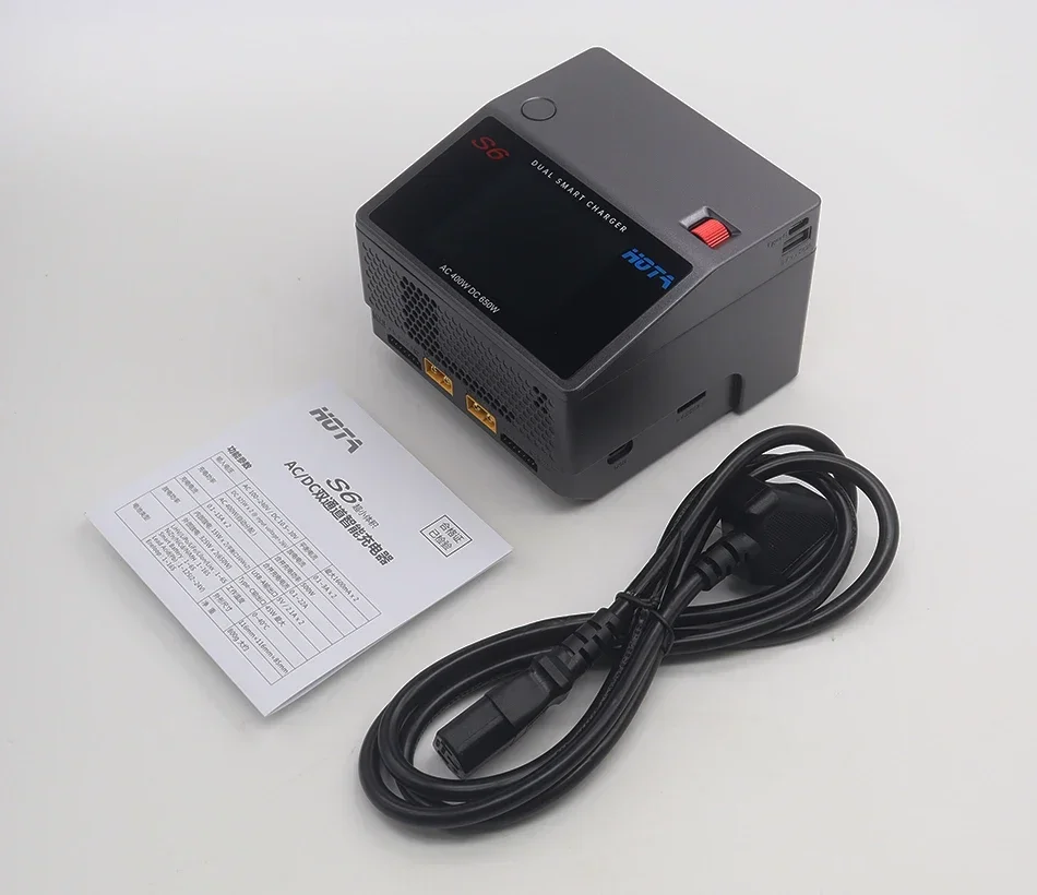 The HOTA S6 supports 2 channels of 400W charging and features a highly optimized charging algorithm with high efficiency. This charger does it all, without over complicating things. It's easy to configure with a clear color LCD, user friendly interface, and has the added bonus of a 5V USB port AND 12V XT60 output for FPV monitors and other electronics!