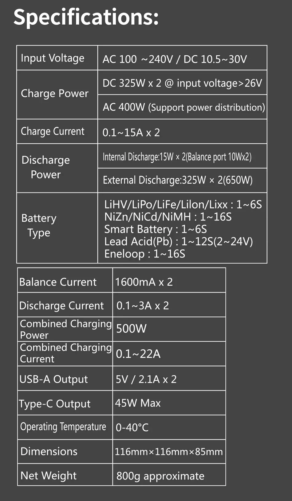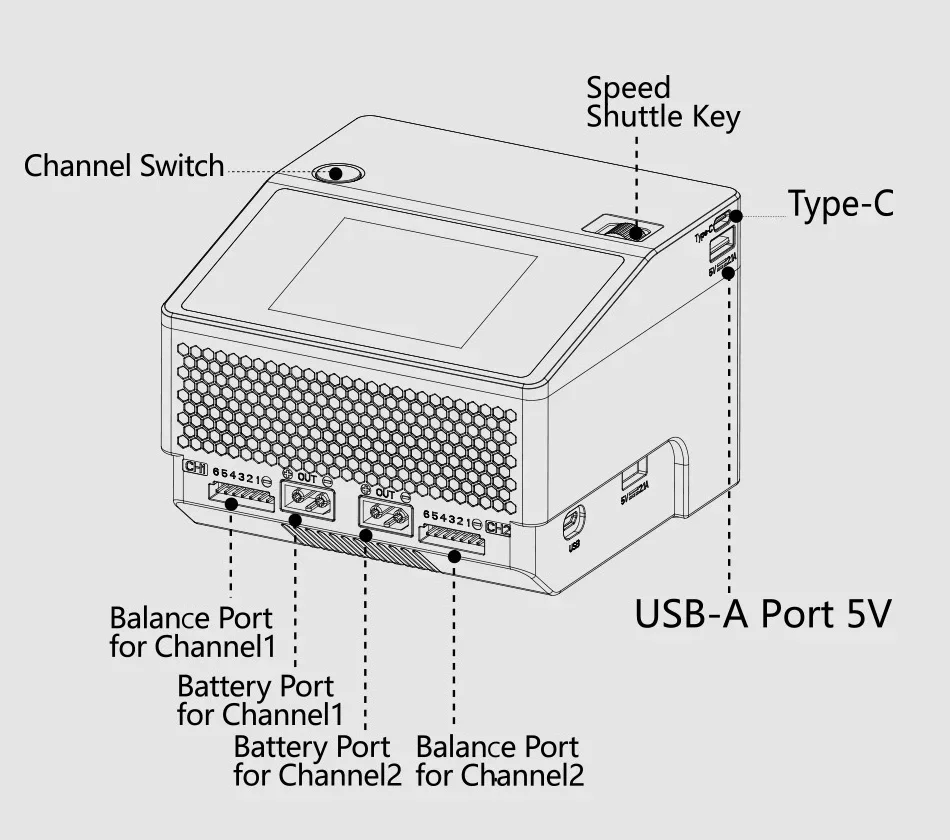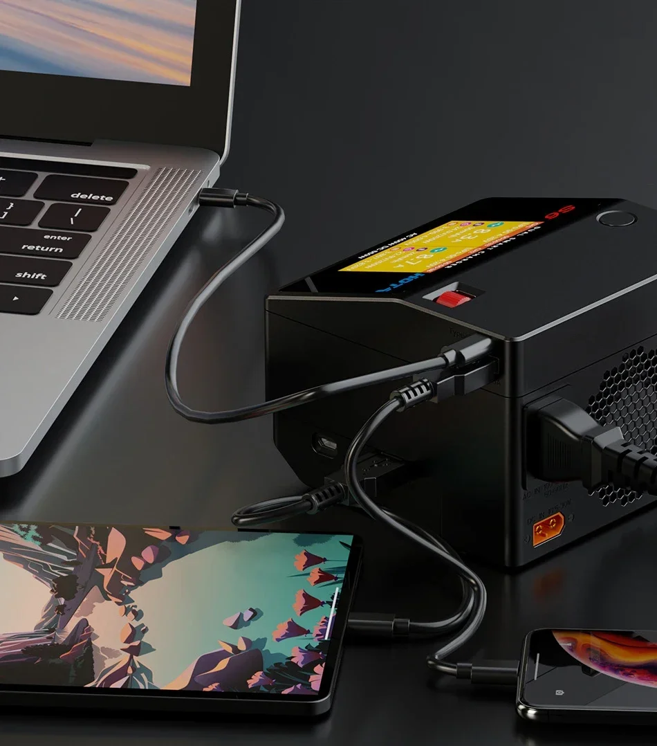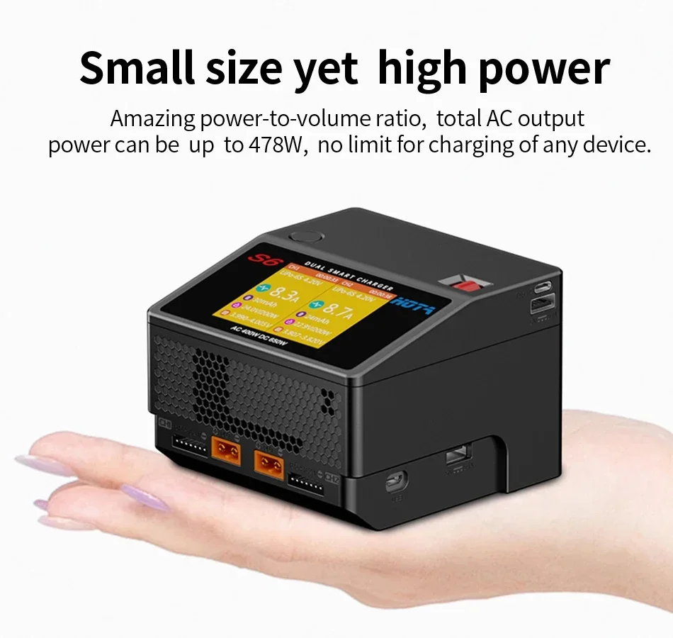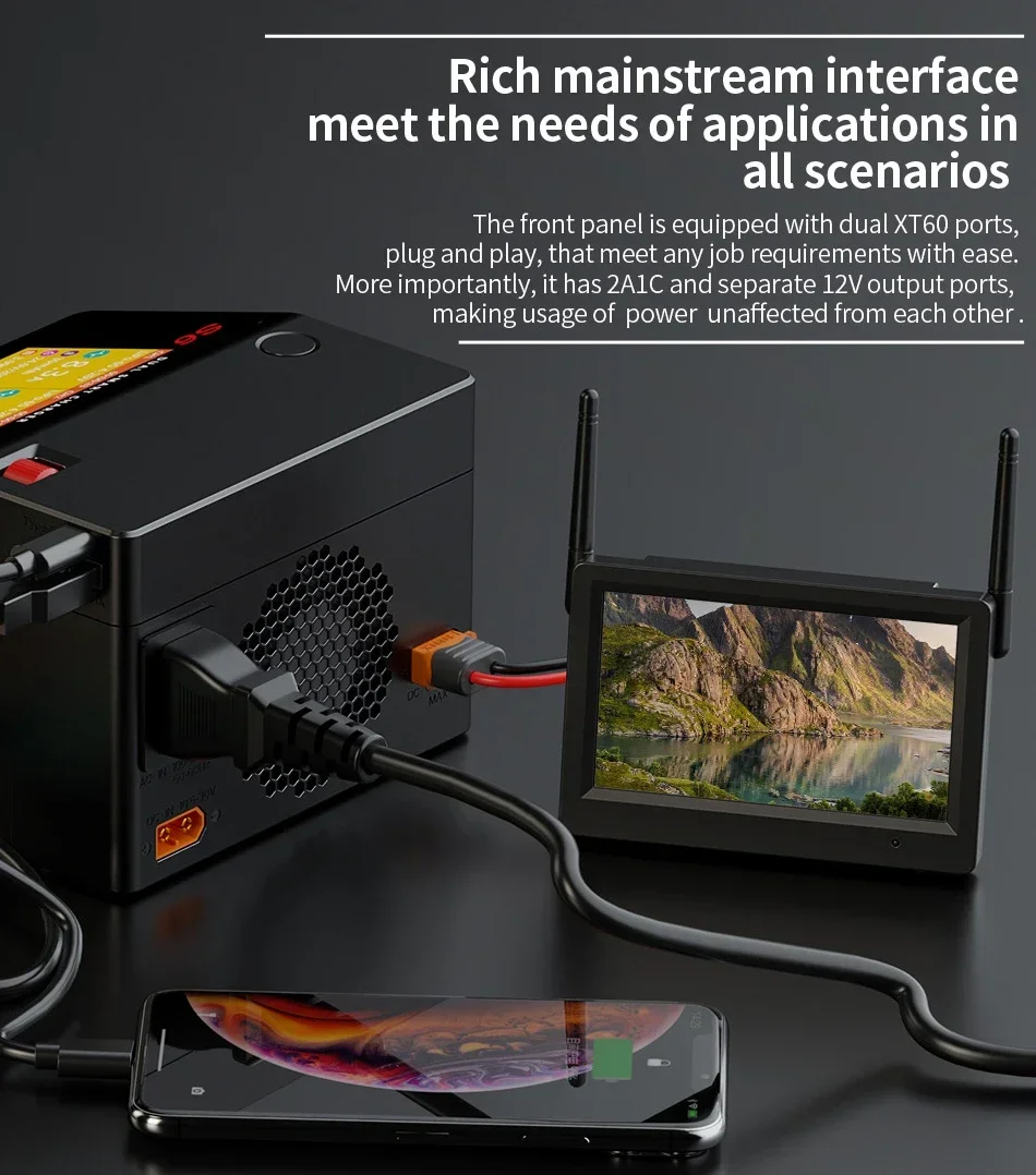 The HOTA S6 supports 2 channels of 400W charging and features a highly optimized charging algorithm with high efficiency. This charger does it all, without over complicating things. It's easy to configure with a clear color LCD, user friendly interface, and has the added bonus of a 5V USB port AND 12V XT60 output for FPV monitors and other electronics!