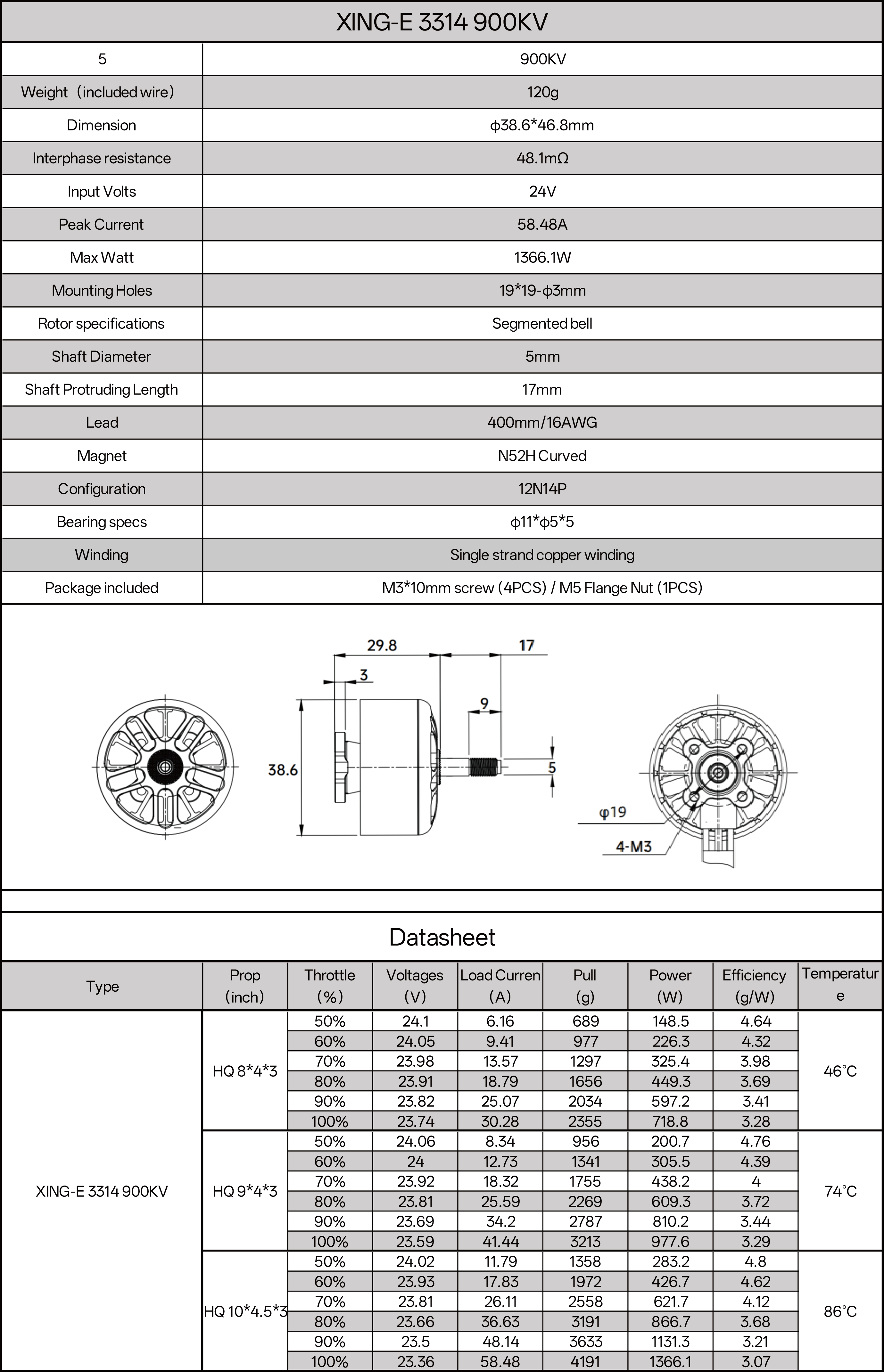 The iFlight XING-E 3314 900KV 6S Cinelifter Brushless Motor features a powerful 1366.1W output, 58.48A peak current, and efficient N52H curved magnets. Designed for high-performance drones, it offers precise control and reliability with a robust single-strand copper winding and segmented bell rotor.