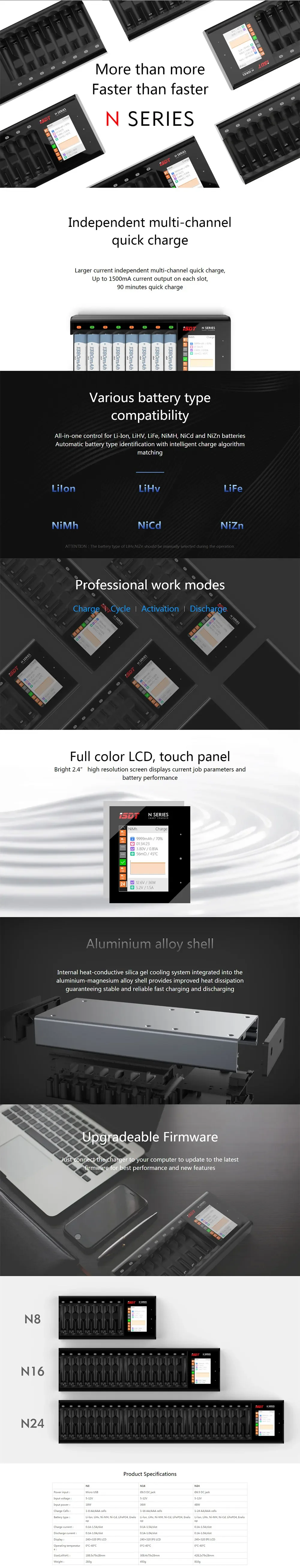 - Various battery type compatibility All-in-one control for Li-Ion, LiHV, LiFe, NiMH, NiCd and NiZn batteries Automatic battery type identification with intelligent charge algorithm matching.