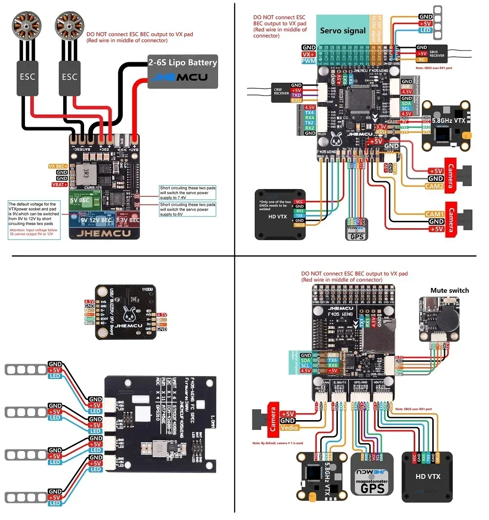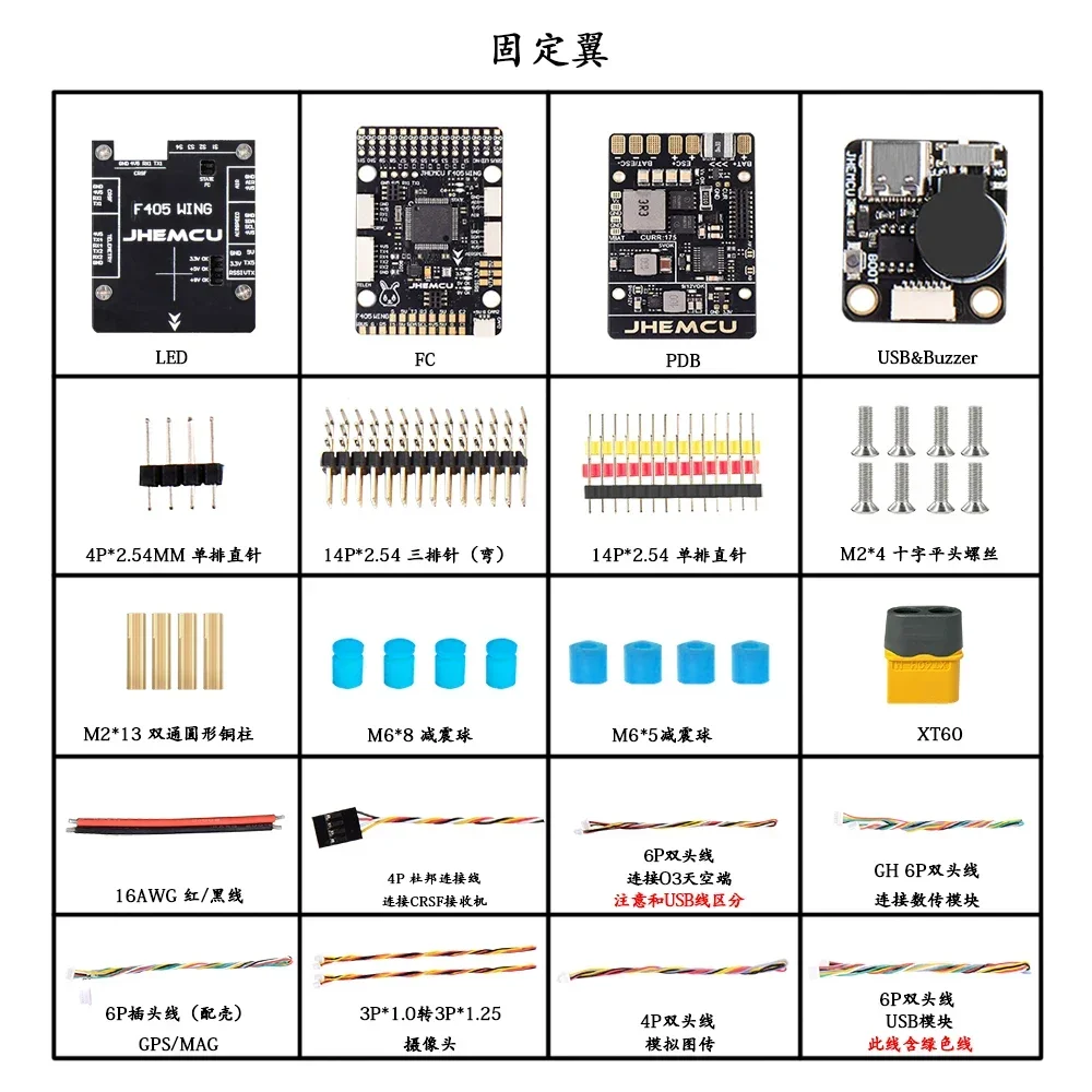 The main control uses F405 chip, 1MB FLASH, rich interface, full-featured. Built-in TF card holder, barometer, gyroscope, OSD, reserved interface socket, can be inserted or welded. With high current PDB board, built-in ammeter detection. Default 5V BEC servo output 8A, can also be set to 6V/6.5A and 7.4V/6A servo power supply through the jumper pads of the PDB. 5V BEC is also integrated on the PDB to power the flight controller and 9V BEC to power the mapping (can be switched to 12V). There is an additional 3.3V LDO reserved. There is a separate 5V BEC on the LED board that can be connected to four WS2812 strips, and the control signal is provided by the LED Strip on the F405. The extended USB interface board has a BOOT button, and a 110 dBm buzzer with a switch to turn it off.