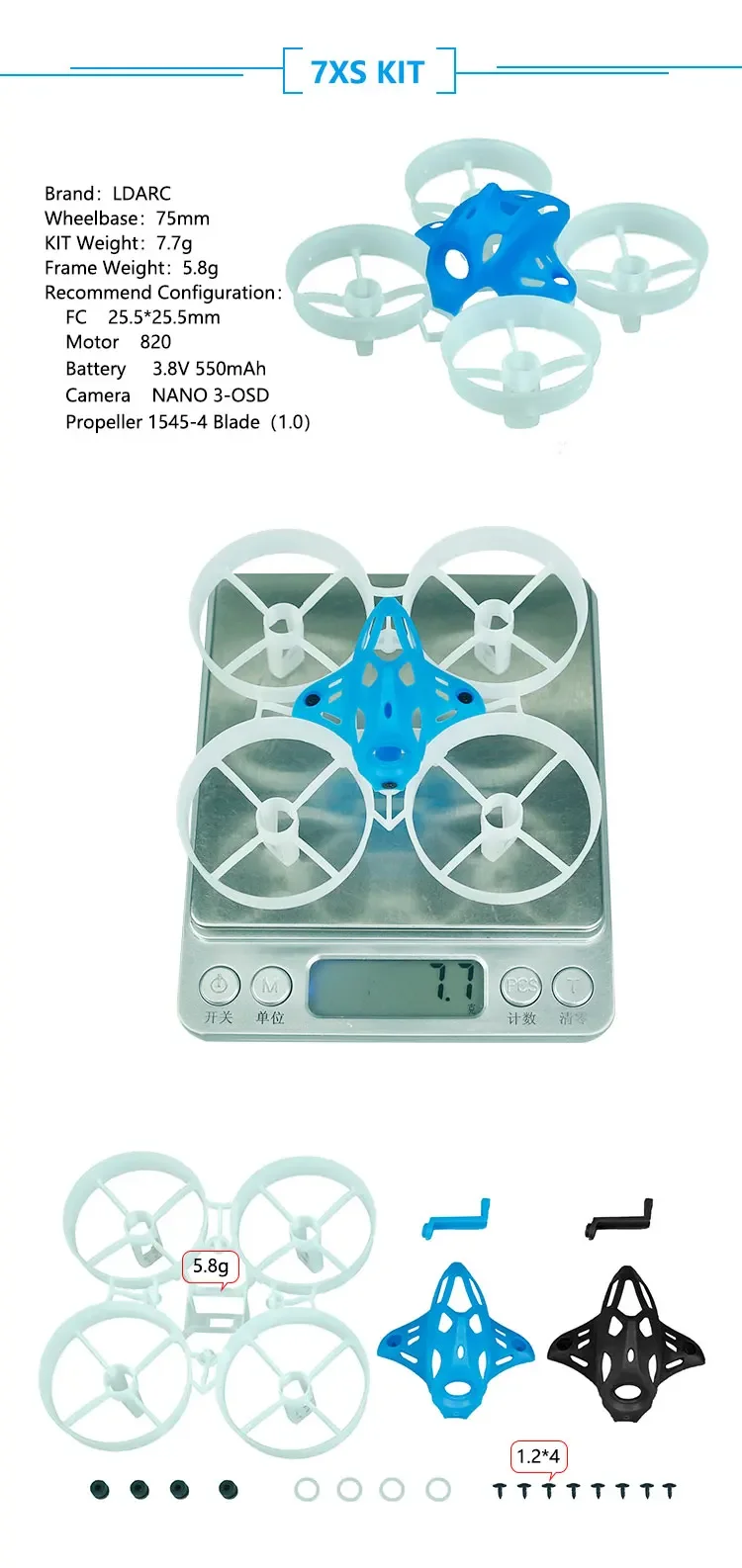 The LDARC TINY 6XS 7XS KIT features a durable 65mm/75mm wheelbase brushed frame, designed for reliable performance and easy assembly. Ideal for micro drone enthusiasts seeking high-quality construction and precise, stable flight.