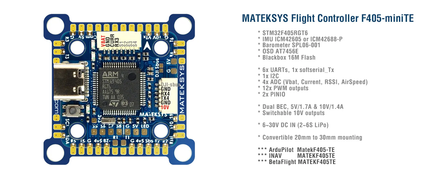 Compared with F722-miniSE 8motors or 6motor+2servos, F405-miniTE support 8motors+3servos in INAV/BF multirotor mixer