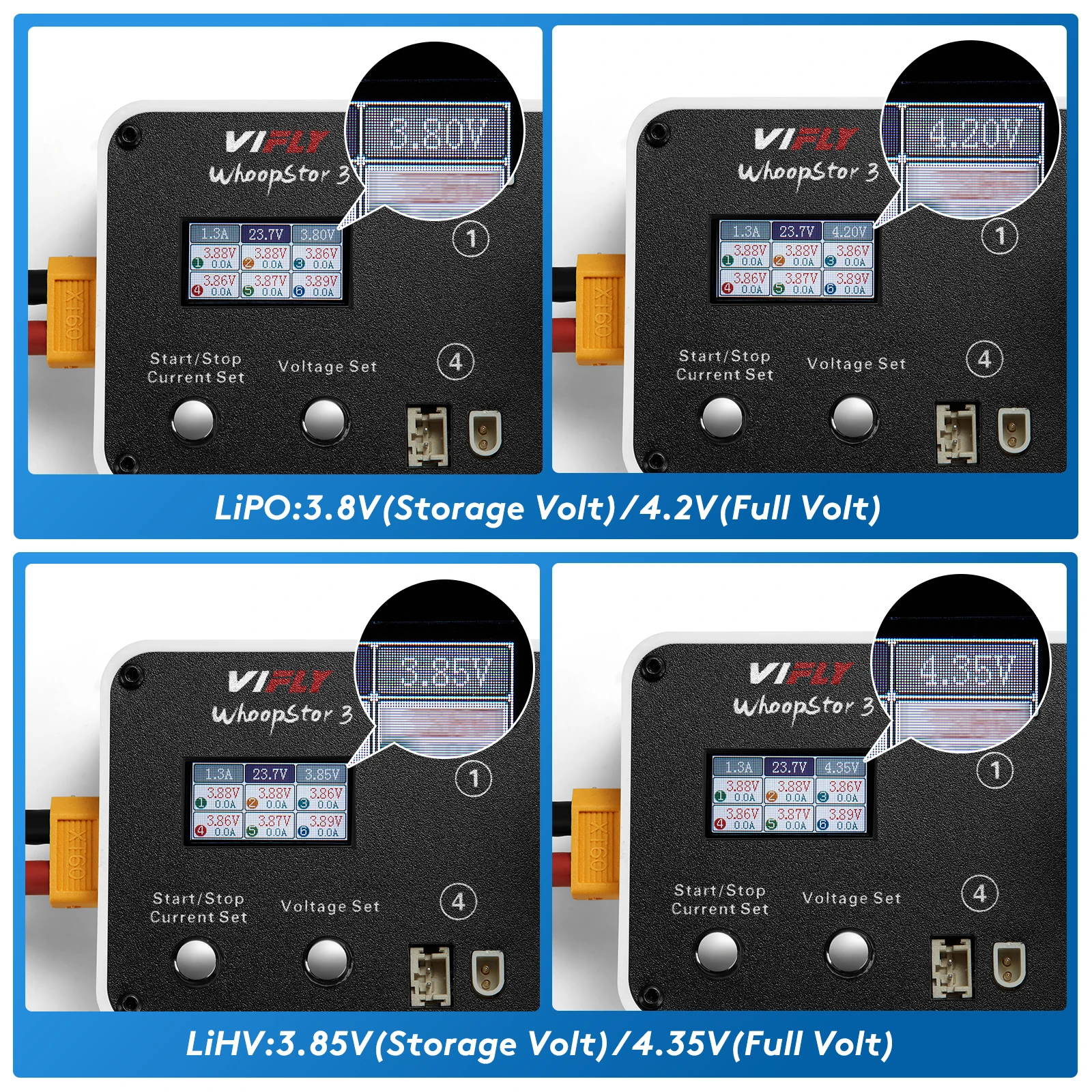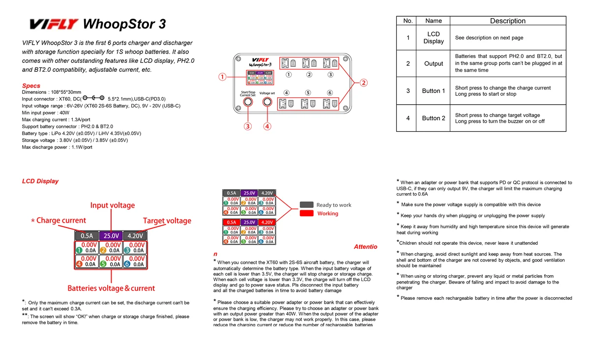 【Storage Charger and Discharger】VIFLY WhoopStor 3 is the first 1S LiPo charger with storage function. It includes both charging and discharging functions. Just select your target voltage, it will do it for you automatically.