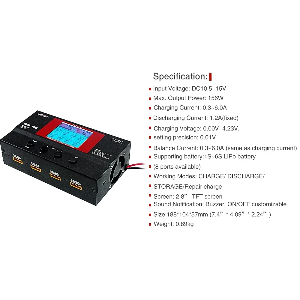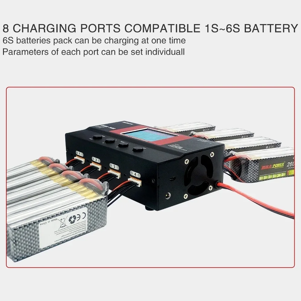 Supporting battery: 1S~6S LiPo battery (4.2V), 1S~6S Li-ion battery (8 ports available), or 1S~6S High voltage lithium battery (4.35V)