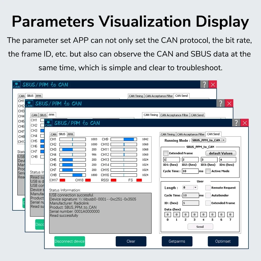 Parameters Visualization Display: The parameter set APP can not only set the CAN protocol, the bit rate, the frame ID, etc. but also can observe the CAN and SBUS data at the same time, which is simple and clear to troubleshoot.